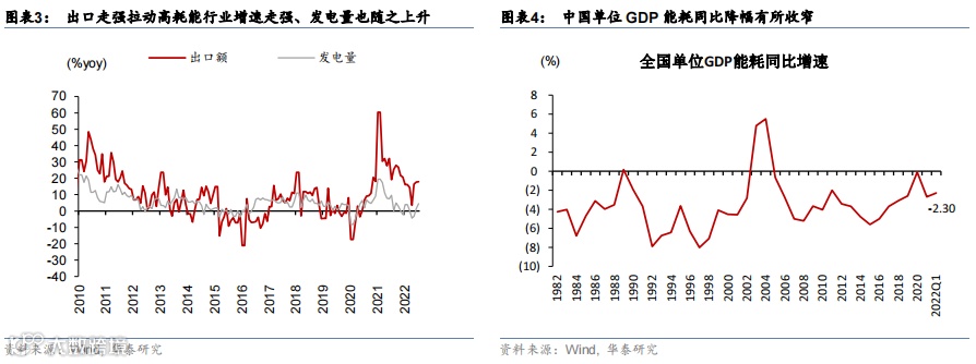 其次,2020年以来,出口对经济的拉动明显上升,工业用电、尤其高耗能行业的产值上行导致单位GDP能耗水平降幅放缓。疫后多重因素推动中国出口增速以及占全球出口份额上升——1)经历全球疫情和俄乌冲突的冲击后,中国制造业在劳工、能源、房租等方面的累积成本优势更为突出;2)近年中国 ODI 上升拉动出口,尤其是对东盟地区——东盟从 2020 年已成为中国第一大贸易伙伴。中国出口竞争力上升一方面表现为中国商品对其他国家的出口替代,同时,真实购买力下降压力下,海外消费者对中国“高性价比”产品的偏好上升(有关中国出口的具体分析,请见《中国贸易顺差逆势上升的成因与启示》2022/8/7)。2021年中国全年出口额同比增速达29.9%、2022年7月出口金额同比增长18%、仍处高位,其中汽车、轻工纺服、机械等行业出口维持强势。外需订单走强之下,高耗能行业增速亦随之上升,如化工、黑色、有色、水泥等,并推升用电量增速。2021年全国发电量同比增长8.1%,为2011年以来最高。实际上,2020年以来,受出口拉动较大的高耗能行业产业增加值同比增速明显高于第三产业的GDP增速。由此,单位GDP能耗降幅放缓:2022年1季度,单位GDP能耗同比下降2.3%,相比疫情前(2019年)的-2.6%的降幅有所收窄,也比2021年1季度的-3.1%明显收窄(图表4)