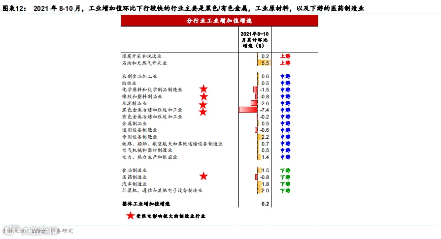2021年8-10月,工业增加值环比下行较快的行业主要是黑色/有色金属,工业原材料,以及下游的医药制造业。2021年8-10月,黑色金属制造业生产下行最快,增加值环比下行3.8个百分点(已季调、非年化,下同),有色金属下行0.8%;非金属工业品中,耗电量较高的水泥、化工、橡胶等行业制造业增加值环比分别下行1.3%/0.8%/0.4%。下游行业中,医药行业也受到影响,环比下行0.4%(图表12)。