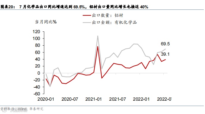 随着全球能源价格底部抬升,中国低电价可能造成一定程度上资源配置的“扭曲”——国内生产、消费、及跨国贸易等领域都有体现。相应调整电价可能对供需结构调整大有裨益。即便在能源危机爆发以前,中国在光伏、电池、5G等产业持续加速布局,对能源和电力的需求已经在快速上升。而欧洲能源危机发生以来,当地化工、有色等高耗能行业生产受影响较为严重,反之,中国的能源结构以煤为主,叠加电价管控措施,高耗能行业生产增速并未受到太多国际能源价格上涨的冲击,出口份额逆势上升。例如,今年1-7月,煤炭和有色行业的增速均在10%以上,中国出口的化工品、有色金属、电力设备与新能源等产品显著增加;7月化学品出口同比增速达到69.5%,铝材出口量同比增长也接近40%(图表20)。尽管当前中国在新能源普及的进程上比其它国家更为迅速,但电价调整滞后导致高耗能产业加速向中国集聚,从资源配置的角度未必是最合理的方案;同时,高耗能行业集聚也意味着中国中长期的节能减排目标可能会受到拖累和限制。电价调整有助于理顺国内电力总供给、及电力资源在不同板块间的配置矛盾。随着民用电占比上升,有必要拉开峰谷电价价差,推动总体电力资源更为有效、合理配置。