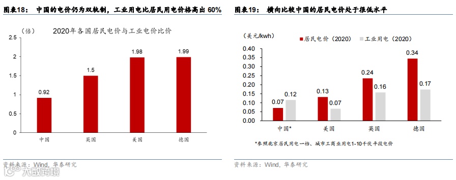 横向国际比较,中国电价明显偏低,尤其是居民用电更甚。按照经济规律,工商业单个用户用电量大、用电时间均匀,高压传输有规模经济效应,因此成本要低于居民用电。所以大部分国家的居民电价都比工商业用电价格要高。但中国的电价仍为双轨制,工业用电比居民用电价格高出60%(图表18)。2021年4季度因煤价高企、煤电企业亏损严重,倒逼市场化电价上浮比例扩大至20%,但整体市场化程度仍然较低。今年俄乌战争爆发后,全球能源价格底部抬升,横向比较中国的居民电价已处于很低水平。例如,德国当前的居民用电价格在0.34美元/千瓦时,是中国的5倍,而美国的居民用电价格也接近中国的一倍(图表19)。另一方面,中国的工业用电价也仅相当于德国工业用电价的67%。