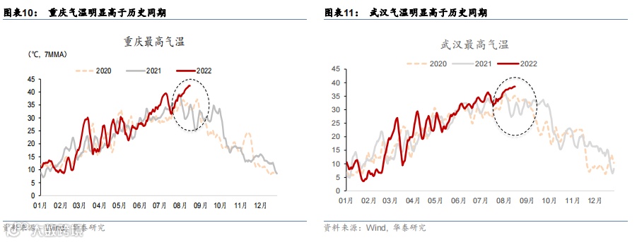 随着气温下降,本轮短期用电紧张有望缓解。本轮限电主要受到极端气候的冲击,川渝、湖北等地 8月的气温峰值创下新高,根据国家气候中心预测,8月29日至9月13日,四川、重庆等地的降水将多于往年同期,而届时全国大部地区气温接近常年同期到偏高。根据往年经验气温正在转入下行区间,目前的极端高温状态或不可持续。随着9月入秋后天气转凉,目前的供需紧张状况能够得到大幅缓解。作为对比,2021年限电更多是人为因素:自8月初起,陆续有省份开始限电限产(如重庆、云南等),9月多数省市开展了工业生产限电措施,影响一直持续到10月,甚至10月以后东北地区的居民用电也受到影响,总体影响持续时间长达2-3个月。