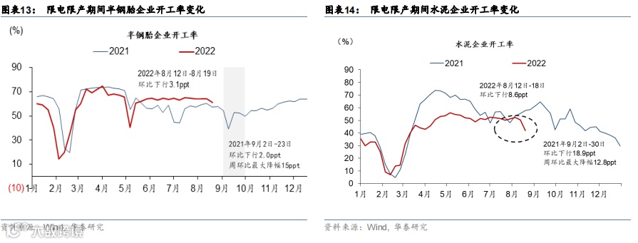 本轮限电无论是在范围还是规模上都小于2021年,但不排除在受影响较大的地区和行业、部分商品短期出现“量缩价升”的类似现象。根据华泰策略组的测算,川渝地区在化工产品,电子元器件等领域占比较高(图表17,《本轮限电如何影响A股配置》 2022/08/21)。按目前限电范围,去年受影响较大的金属、医药等行业暂时不受太大影响,但若后续限电范围和时间超预期,如河北、江苏、云南、广西等地均升级限电措施,则受影响的行业可能会进一步增多。从高频指标来看,限电限产叠加经济周期走弱,8月第2周部分工业开工率已经有所反映:8月12日-18日水泥企业开工率环比下行8.6个百分点,半钢胎企业开工率环比下行3.1个百分点;此外,8月15-19日,全国物流园区吞吐指数/整车物流指数分别环比下行1.3%/0.9%,也是由于局部地区限电限产的影响。