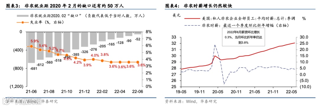 美国6月新增非农就业+37万人(季调后)、明显好于彭博一致预期的+27万人(前值+38万人);今年3-5月非农就业终值较初值共下调10万人(月均下调3.3万人)、而2021年1月~今年2月份月均上调10.6万人。整体而言,尽管总需求先行指标减速,但就业市场仍供不应求——低失业率+高岗位空缺/求职人数比+服务业岗位增幅大+薪资环比折年增速仍超过3.5%,继续巩固通胀的“粘性”。联储短期放缓货币政策收紧节奏的可能性小,需等待“超额”职位空缺逐渐被吸收、对通胀的推动动能下降。非农数据公布后,美国10年期国债利率从3%上行至3.05%。