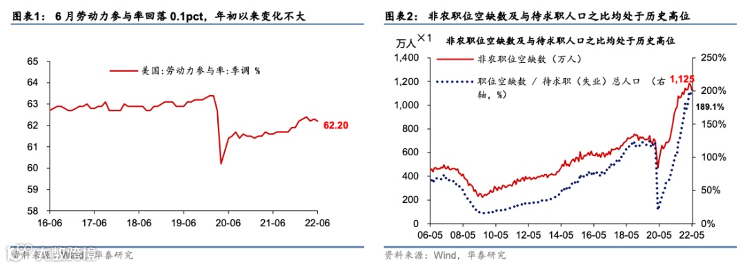 美国6月份劳动参与率62.2%、小幅回落0.1pct(彭博一致预期62.4%),今年上半年均基本持平(均值为62.3%)。失业率3.6%,连续4个月持平。劳动参与率改善缓慢,失业率持续维持低位,强化薪资增长粘性。部分适龄劳动人口或已“半永久”退出就业市场(主动退休),而就业市场依然紧张——截至已公布的5月数值,非农职位空缺数与待业(暂时失业但有求职意愿)人口之比仍接近190%,而疫情前的2019年平均在120%左右,就业市场远远供不应求。