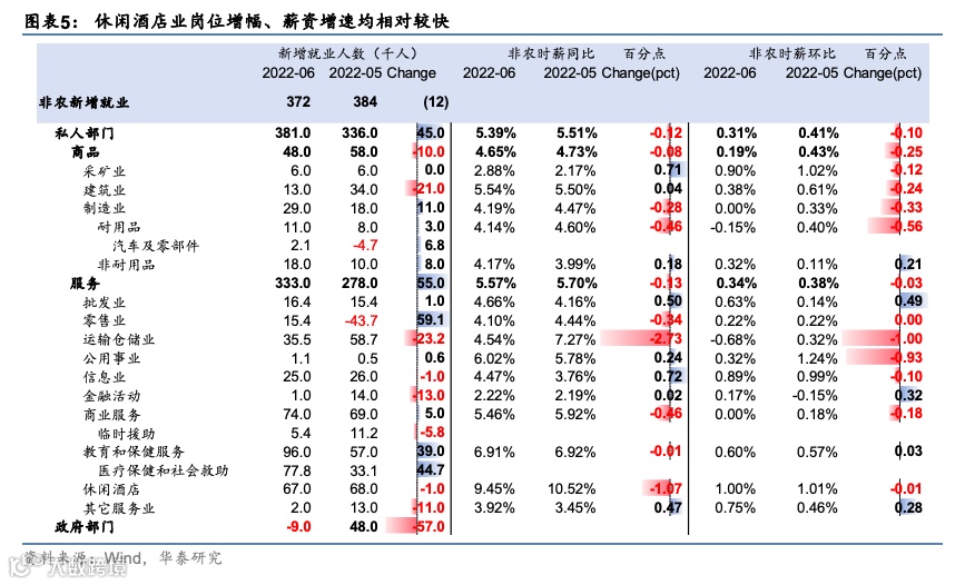 6月非农时薪环比上涨0.3%、持平彭博一致预期,前值0.4%。休闲娱乐业薪资水平维持较快上涨,服务业通胀仍较有粘性。去年Q1~今年Q1,非农时薪环比折年增速依次为1.9%、6.3%、5.4%、6.1%、4.8%;而今年Q2的时薪环比折年增速为4.2%,薪资涨幅仍然较快、但相对此前稍有放缓。6月份,教育和保健业(0.6%)、休闲酒店业(1%)薪资环比仍然快速上涨,尤其是休闲酒店业薪资增长仍在所有行业中名列前茅。