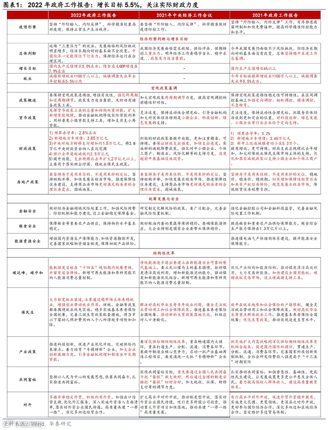 1)预算赤字率如期下调至2.8%左右,相比2021年下降0.4个百分点;