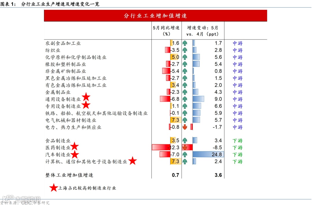 2)5月制造业投资增速为7.1%,较4月的6.4%略有回升。分行业看,投资增速加快的行业包括交运设备(21.8%,+26.1个百分点,下同)、电气机械(38.3%,+10.3)、计算机(20.7%,+9)和汽车(13.1%,+6)。但农产品和食品加工行业投资增速快速下滑。