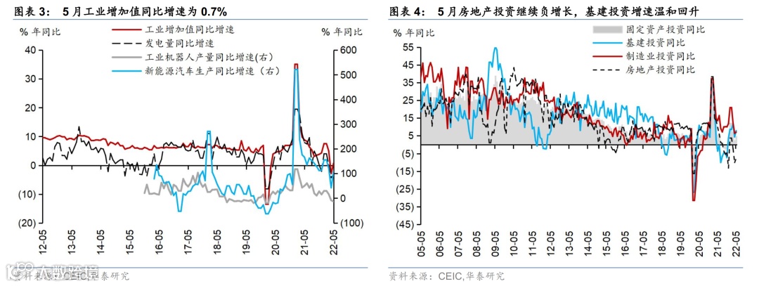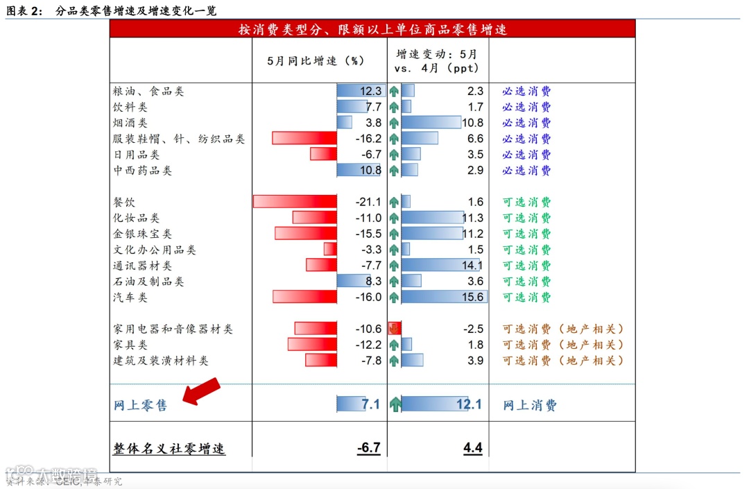 5月居民消费从“冰点”反弹、但继续疲软。社会消费品零售总额名义同比增速从4月的—11.1%回升至-6.7%,略高于Wind一致预期-7.6%。分类别看,汽车、手机的反弹最为显著、但仍为负增长——汽车销售同比增速从上月的-31.6%回升至-16%,通讯器材销售同比增速从上月的-21.8%上升至-7.7%。大部分可选消费增速仍为负,但石油制品、粮油食品等类别销售金额同比增长较快,可能也受到价格上涨的影响。此外,5月餐饮零售额同比下滑21.1%,相比4月仅微升1.6个百分点。房地产相关消费继续低迷,建筑装潢材料、家具和家电零售增速分别为-7.8%/-12.2%/-10.6%,较4月变动不大(图表2)。物流改善后网购增速有所回升,线上零售同比增速回升12.1个百分点至7.1%。