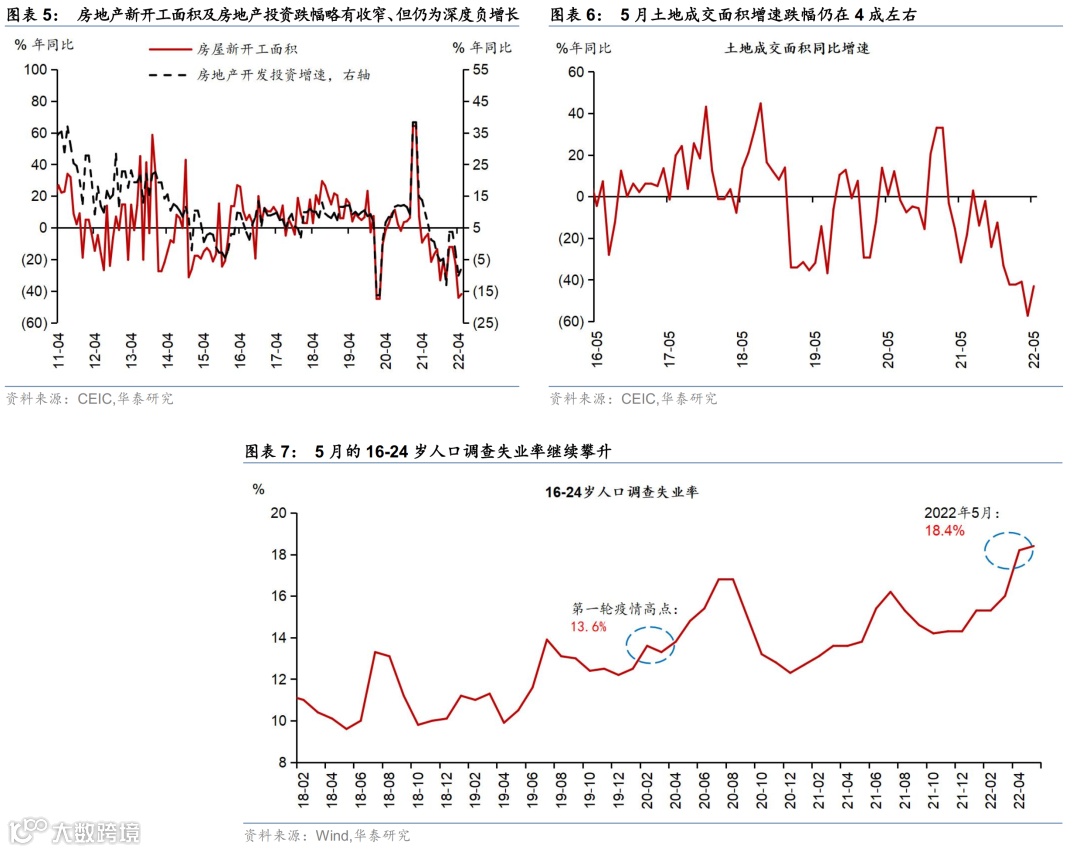 随着疫情缓解,生产和消费呈环比回升态势、但地产指标仍疲弱、增长压力持续存在;近期各类稳大盘政策实施力度和效果需进一步观察。在疫情未出现大规模反弹的环境下,复工复产对当前增长和信心的提振作用开始显现,同时央行5月20日非对称下调LPR以来,各类稳增长政策频繁出台(请见我们2022年6月7日发布的报告《深入复盘近期多样化的稳大盘政策》),短期内3季度增长环比回升的趋势无法证伪。但值得提醒的是,当前地产周期仍然相当疲弱,尤其是开发商现金流和竣工等指标低位继续下滑、或拖累当前地产部分宽松政策的有效性。此外,5月货币信贷数据显示,尽管流动性较为宽松,但经济自身融资需求不强。往前看,如果地产周期不能有效企稳,经济增长可能持续运行于潜在增速之下,则失业率将继续高企。此外,在全球粮食和能源价格高企、以及国内猪周期开始反转的背景下,下半年海内外通胀走势是否会制约国内货币政策宽松也值得关注。