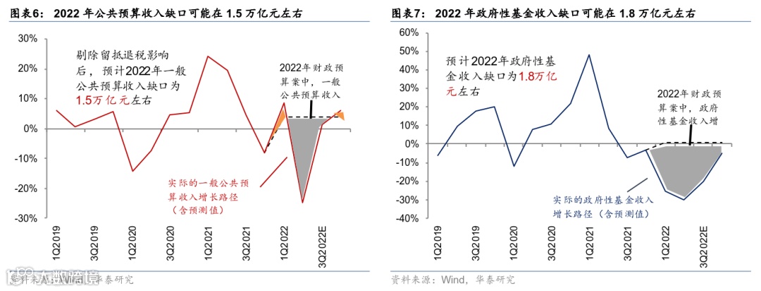 随着 6 月中下旬人大常委会的日程临近,财政预算补给的时间窗口也随之打开。虽然目前市场对财政预算扩张的形式、载体、及用途有诸多猜测。但根据我们的测算,本次财政预算赤字扩张、无论技术上是否计入赤字,实质上可能都有较大的份额将用来补给疫情带来的“被动”收支缺口、即企业收入增长下行及土地市场遇冷的背景下,财政收入增长无法匹配支出进度的问题。根据我们的测算,今年全年的预算外收支缺口可能达到 3 万亿人民币以上(图表 5-7,具体测算参见《千呼万唤的稳增长政策关键窗口期|5 年 LPR 意外下调后再谈宏观与政策》)。所以,如果各项新增财政净增预算及预算外超过 2 万亿元,都应该不足为奇。相反,如果广义财政(中央+地方+社保+国企上缴)各个层面的增量资金补充远远低于所需体量,那么稳增长效果也有一定的不确定性。