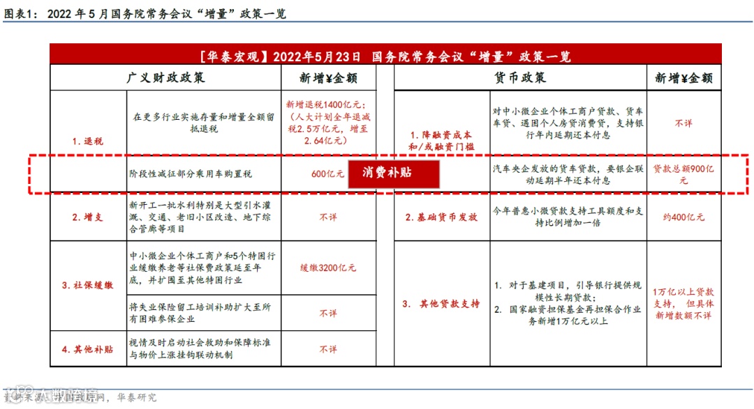 在财政层面,明确数额的增量“宽松”政策包括:1)新增1400亿元留抵扣税(由此全年额度上升至2.64万亿元);2)阶段性减征部分乘用车购置税600亿元,3)缓缴社保3200亿元,以及4)其他金额尚待明确的纾困及补贴政策。