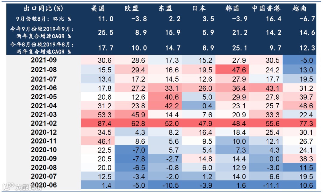 9月份,我国往美国和东盟出口加速增长。与2019年9月对比,我国对美国(+25.5%)出口的两年复合增速较前值再走高近8个百分点;往东盟(+15.9%)出口两年复合增速走高1.2个百分点;往欧盟和日韩出口的两年复合增速小幅放缓。环比来看,9月份我国往美国(+11%)出口金额增幅最大;或说明欧美疫情边际放缓之下,美国需求边际企稳相对最快。
