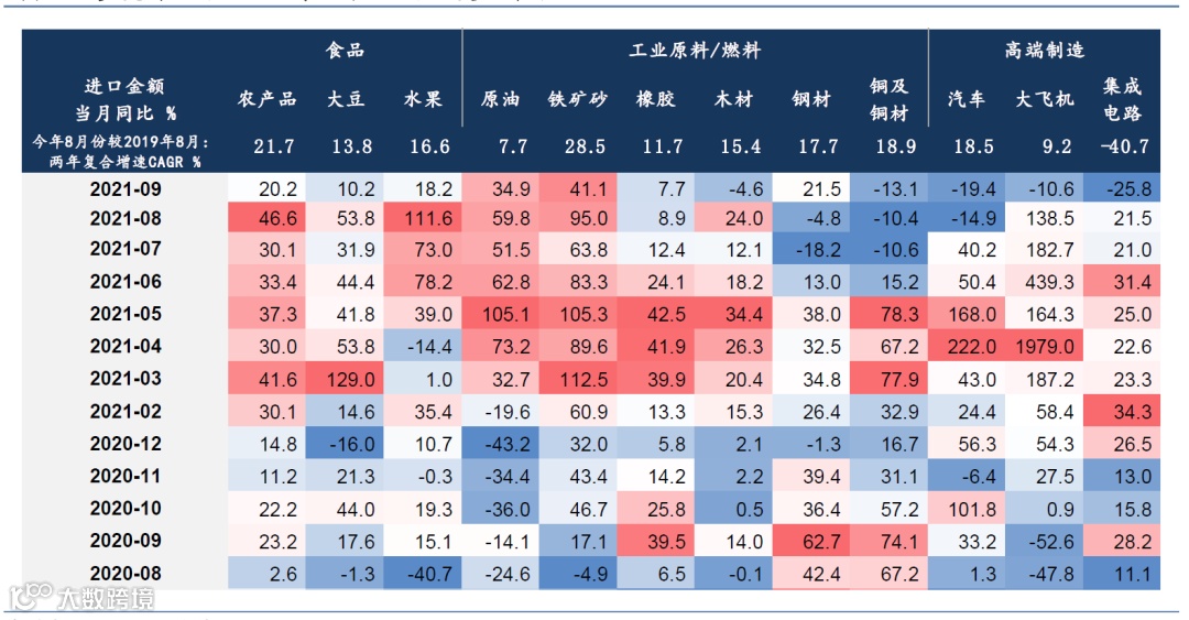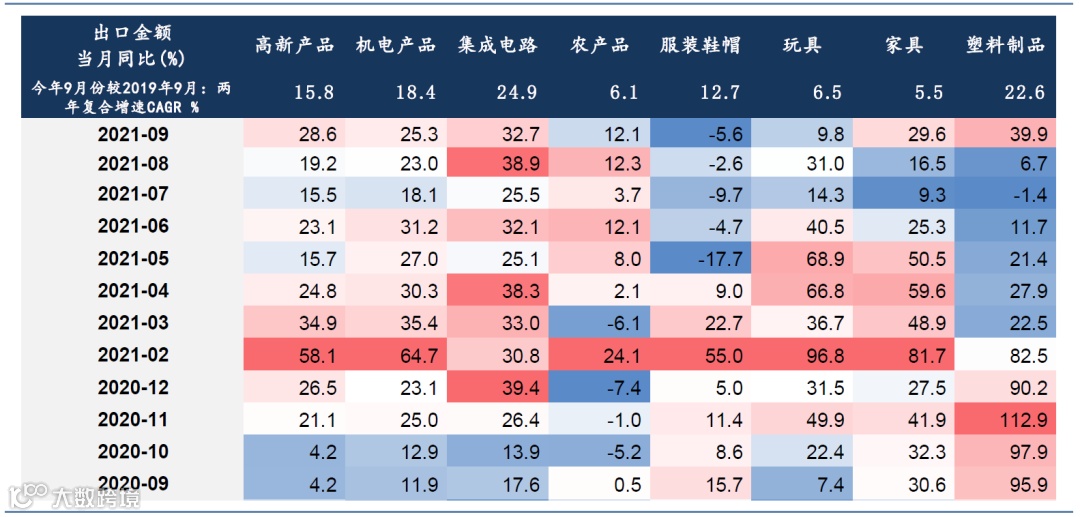 据海关总署,美元计价,今年9月我国出口同比增长+28.1%(wind一致预期+21.1%、前值+25.6%);今年9月出口额较2019年9月两年复合增速继续上行到+18.4%,较前值上行1.4pct;季调环比折年率+29%(前值26.2%)。尽管去年基数走高、出口增速依然连续两个月上行。9月份对比8月份,服装(-5%)、鞋(-7.6%)出口金额回落,而机电产品(+6.3%)、高新技术产品(+12.3%)环比升幅较大;机电产品、集成电路、塑料制品领跑主要产品出口同比、及两年复合增速。高新机电产品和芯片出口开始加速,或说明前期积压(订单)供给恢复加快;一定程度上缓解全球关键生产物资供给端的瓶颈压力。