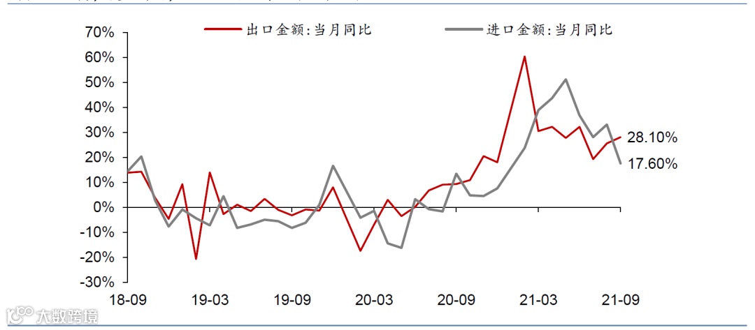 如我们在《海外:疫情影响边际缓和,通胀筑顶》(20211007)所述,欧美疫情边际趋缓,而美国的需求、价格等指标有望领先于欧洲企稳——美国贸易逆差继续扩大。考虑东盟国家生产受疫情影响仍未复原,东亚国家中韩出口短期内或继续受益。据海关总署10月13日最新公布数据,今年上半年,我国出口和进口的国际市场份额分别约为14.5%、12%,同比分别提升了0.9和0.8个百分点——我国贸易份额的提升如期具有较强持续性。在内需下行压力加大的背景下,出口和顺差动能短期仍较强劲,对(Q3)我国经济增长的拉动有望强于二季度。