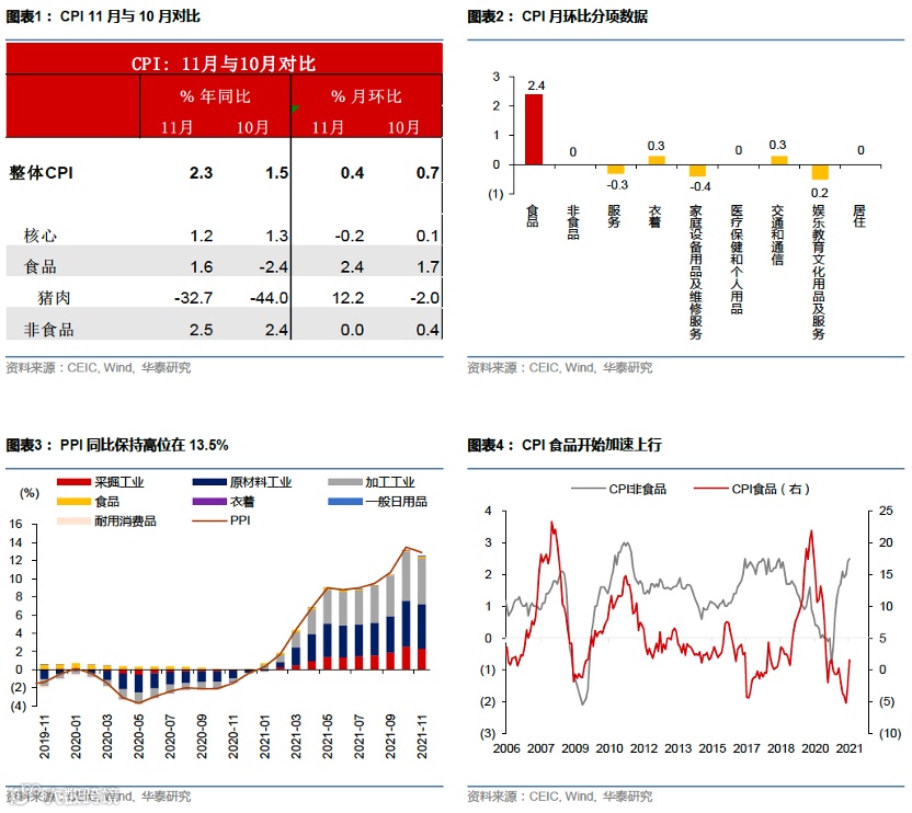 11月PPI增速小幅回落至12.9%,原材料价格下跌在PPI中体现可能有滞后。CPI食品推动CPI显著上行至2.3%,核心CPI保持温和。