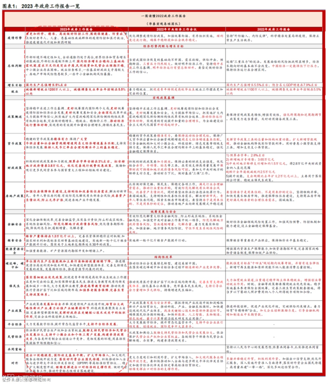 总体而言,2023年政府工作报告有关经济政策及各项目标基本符合预期。宏观政策将延续2022年12月中央经济工作会议稳增长、稳就业、稳物价、稳信心的总体基调(参见2022年12月17日发布的《中央经济工作会议:促发展、重稳定》)。2022年增长目标确定在5%左右,位于我们此前预期的区间下限,但对就业目标、促增长目标的描述较2022年两会更为积极,且外需及疫后复苏均超去年12月目标制定时的市场预期,不排除实际执行力度更为乐观。