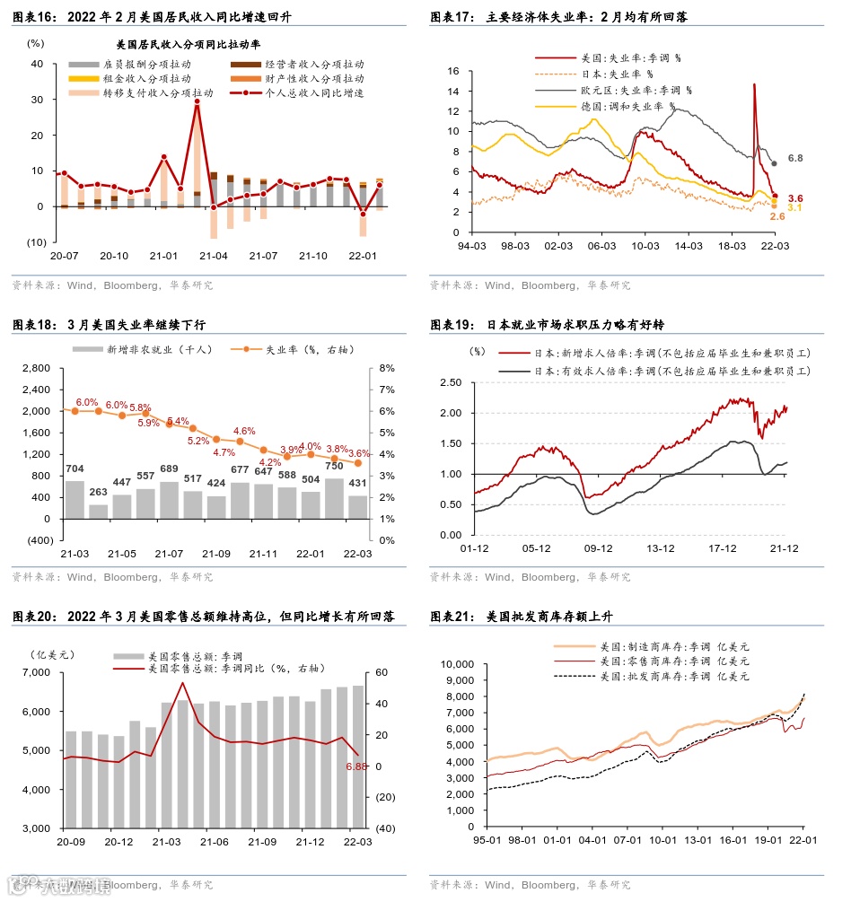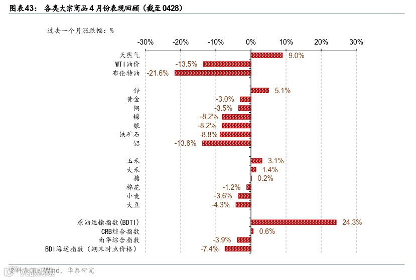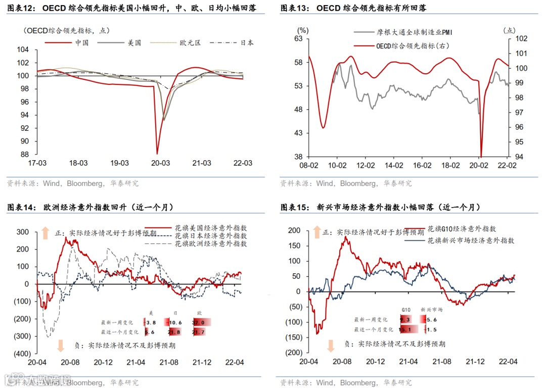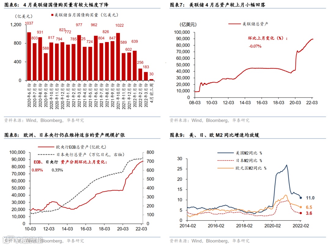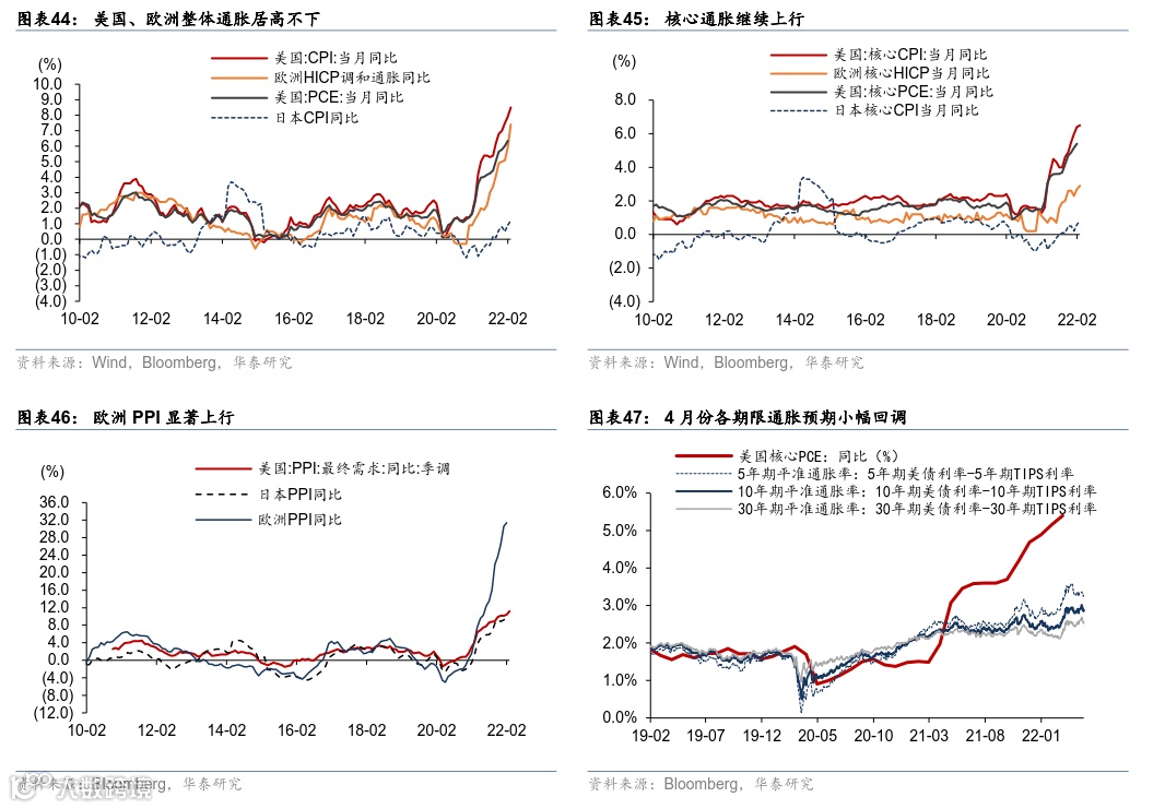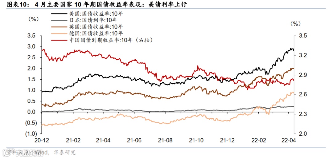 4 月份,海外疫情大幅缓和、服务业消费加速回升,而欧美实物消费和全球外贸减速。通胀预期仍在高位、能源/食品/服务业价格推动美欧整体通胀继续上行,美联储重申控通胀为核心目标,预计 5 月份加息+50bp、并可能开始缩表。同时,地缘政治及“能源自主”需求推升欧洲财政刺激预期;美国及欧元区公债长端收益率均大幅上行,美元真实利率接近“归零”,美元对一揽子货币走强。