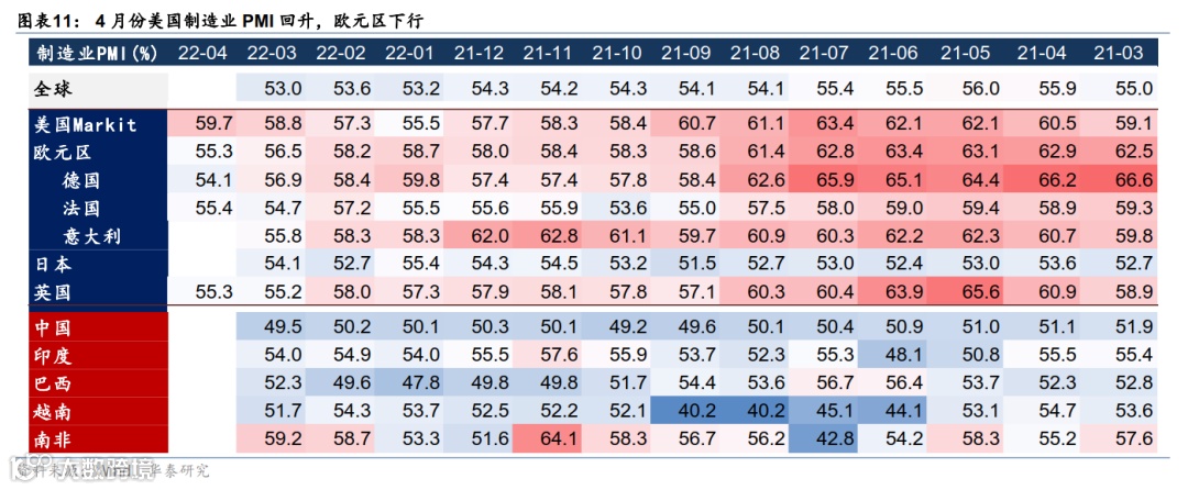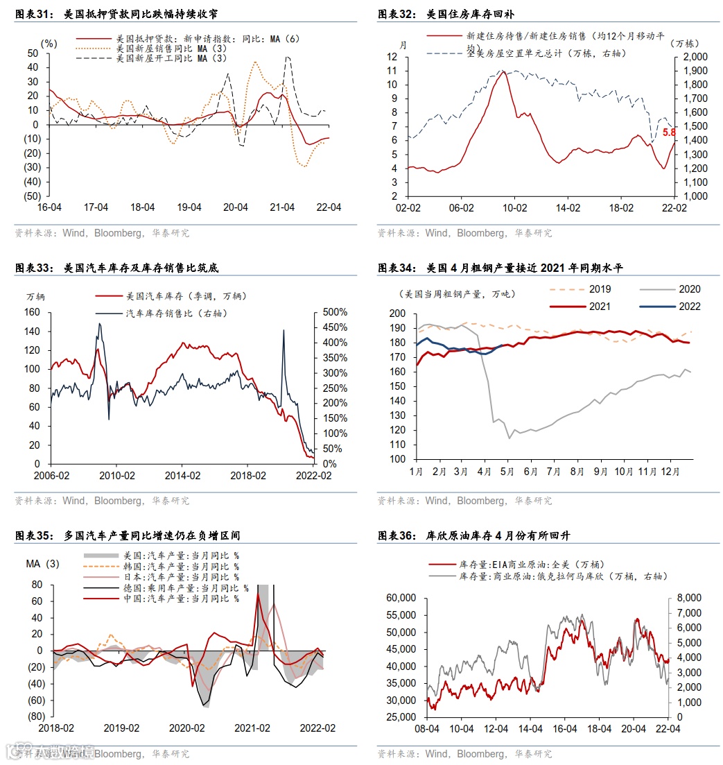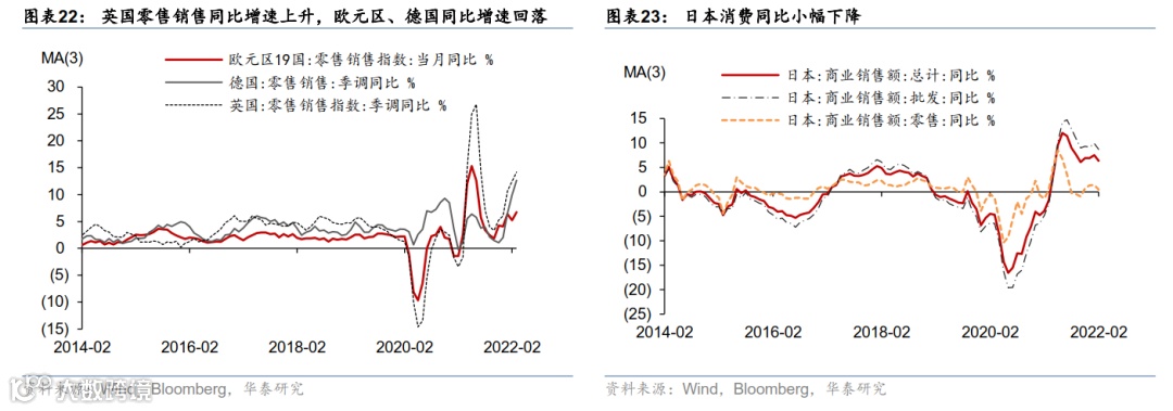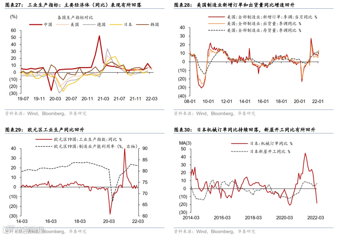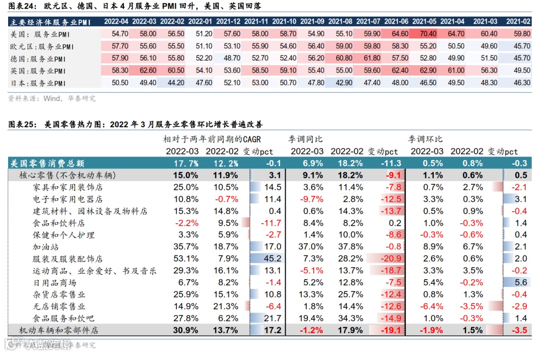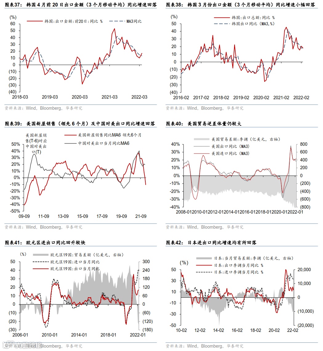 欧美实物消费有所“透支”减速,服务消费或逐渐主导居民支出增长。美国 3 月份餐饮/酒吧/商场/加油站等出行及体验式服务消费增长强劲,而机动车消费减速;实物消费减速或拖累全球外贸增速逐渐放缓,韩国 4 月前 20天出口(3 个月移动平均)同比下滑到 13.2%、连续两个季度减速。东南亚的越南、泰国 3 月份出口金额同比增速连续两个月回升——或由于中国大陆疫情及防控影响生产和出口、而南亚各国疫情趋缓之下开始加速复工。