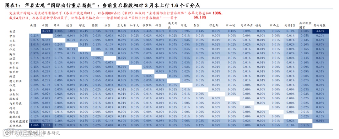 4 月份,海外疫情大幅缓和、服务业加速重启。截至 4 月末,全球 7 天平均新增确诊人数从 3 月末的近 150 万人回落到 63 万人,只比去年 11 月末、O 毒株公告前高 5 万人/天。4 月份,3 月的疫情“焦点”韩国、越南、德国&法国(3 月份反弹)新增感染人数均明显回落。“华泰宏观国际出行重启指数”达到 66.2%,较 3 月末上升 1.6 个百分点。截至 4 月末,全球商务航班数达到疫情前同期的 8 成,美国航空安检人数、纽约地铁客运量分别达到疫情前同期的 9 成和 6 成。