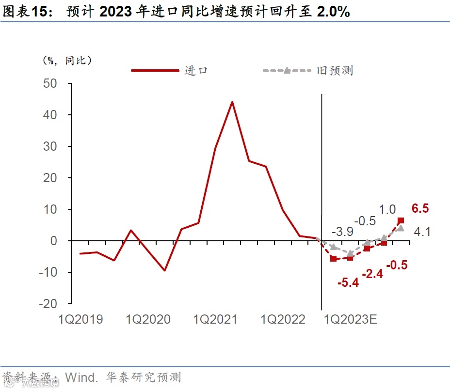 进口方面,预计2023年(以美元计)名义进口增速将从2022年的1.2%回升至2%附近,其中今年4季度到明年1季度将继续下滑、而明年2季度起将随着内需回升而持续走高(图表15)。一方面是今年4季度疫情扰动下进口同比增速加速回落,因此下调全年进口同比。另一方面,随着消费与地产相关产业链对增长贡献明显上升,明年内需回升将提振内需相关的进口增速。