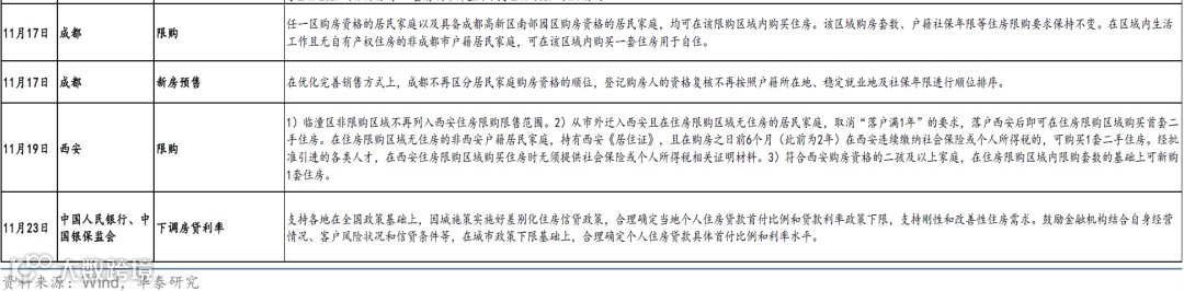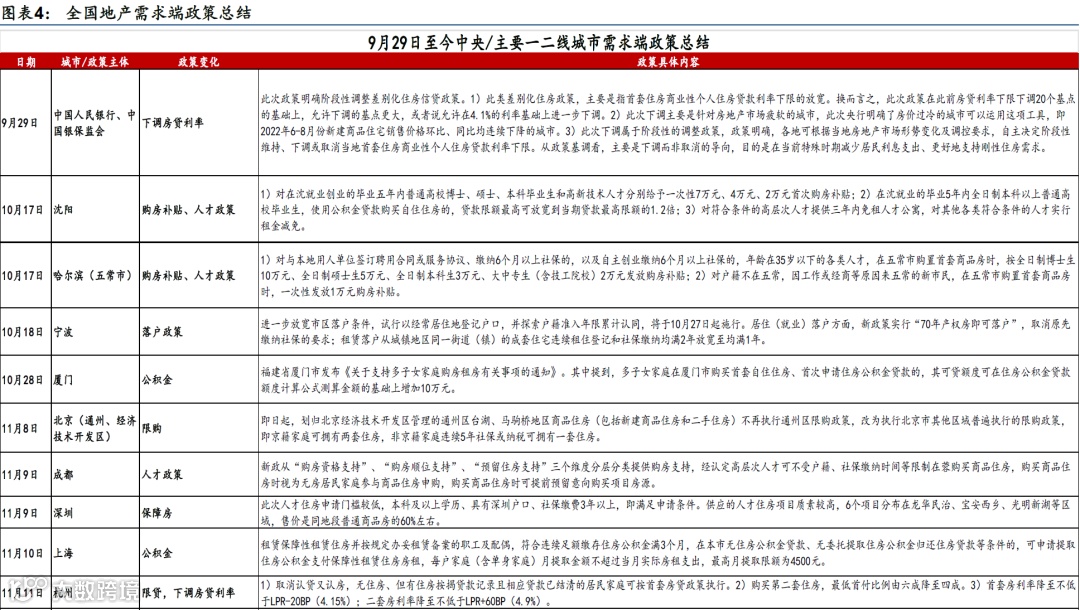 与此同时,地产相关政策,尤其是供给侧的“三支箭”也悉数推出,需求端政策继续稳步放松,且相关政策执行在持续优化中。11月以来,多部委稳地产周期政策密度、力度和协同性明显上升:
