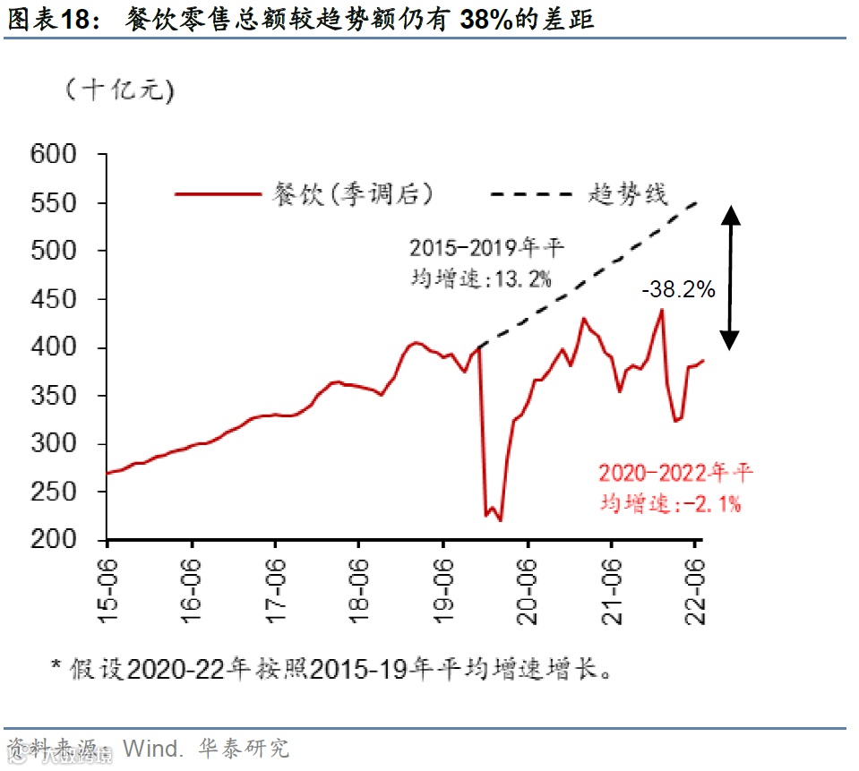 疫情影响减弱后,人员出行活动等在2023年有可能恢复至疫情前的9成甚至9.5成,因此,我们预计餐饮等线下及体验式消费相关的必选消费可能持续回升。目前来看,餐饮企业零售额仍较疫情前的趋势水平有近四成的提升空间(38.2%,图表18)。