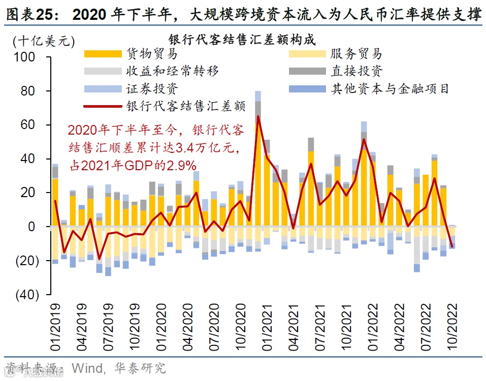 2)从跨境资本流动看,2020年下半年来银行代客结售汇顺差累积3.4万亿元,占2021年GDP的2.9%,尤其是经常账户与直接投资项下持续录得大规模净流入(图表25)。