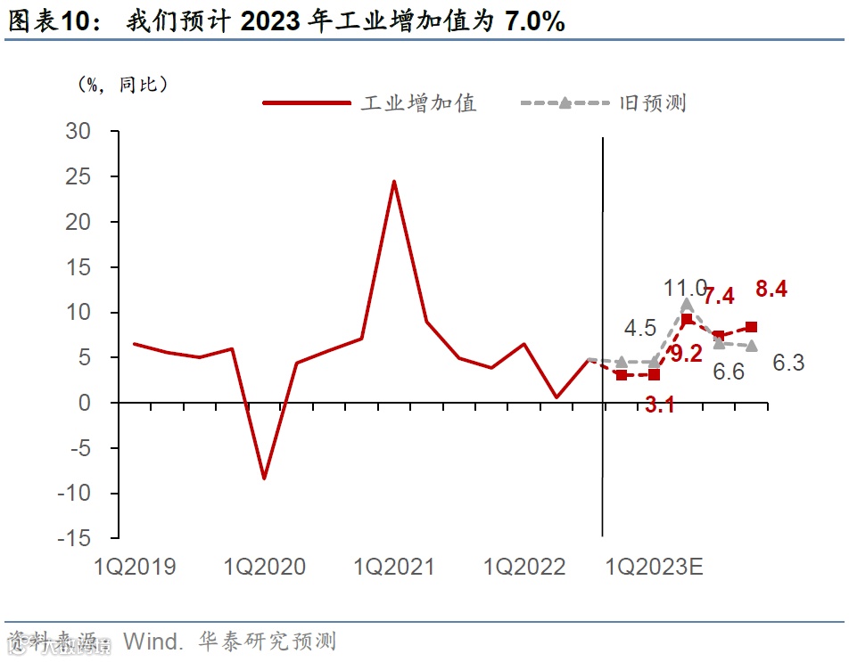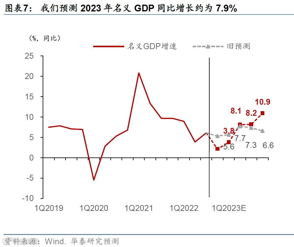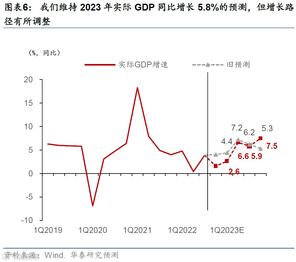 同时,值得注意的是,由于2022年4季度环比增长比此前预测更低、明显拉低2023年GDP增长的“起点”,若需达到和此前一样的同比增速,隐含的2023年上半年环比增速更高且且2023年全年同比增长的曲线呈更明显的“前高后低”走势。具体看,我们预计2023年1-4季度的同比GDP走势为2.6%,6.6%,5.9%,7.5%。(图表6)