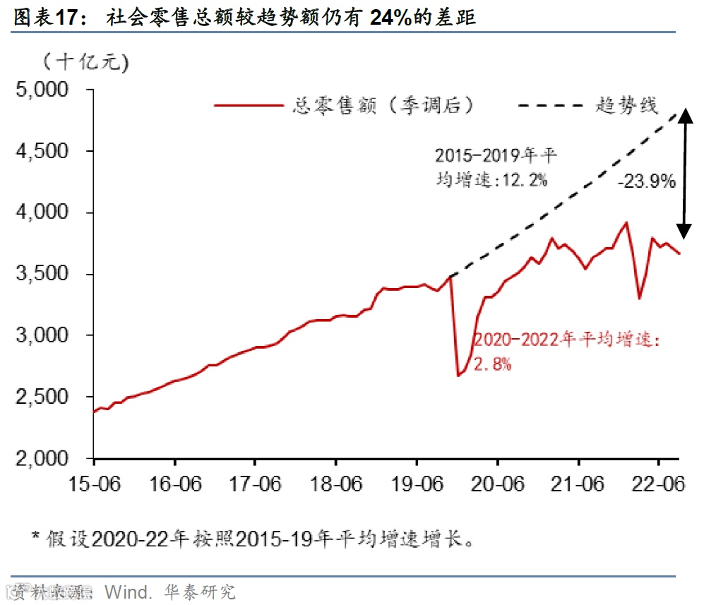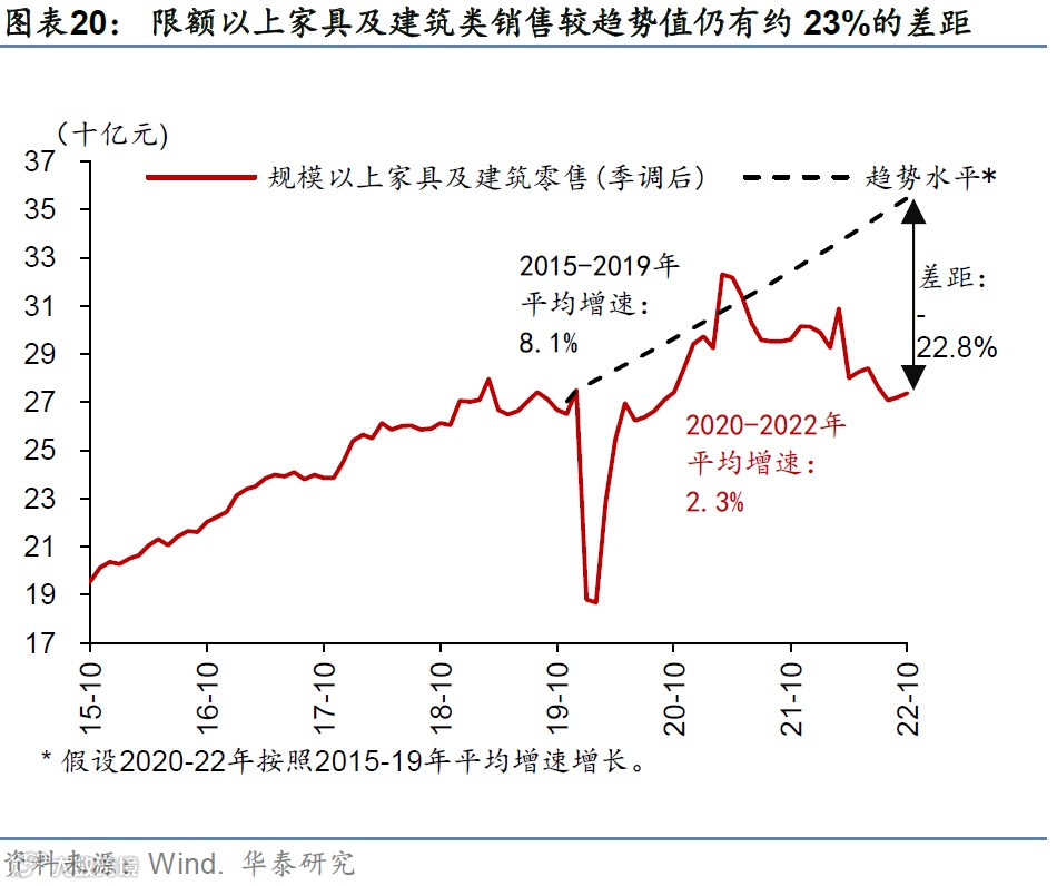 2023年,随着疫情对经济的影响持续减弱,出行社交活动的恢复让“消费场景”逐步恢复,叠加经济总体企稳回升,我们预计消费活动有较大复苏空间,特别是随着出行活动逐步恢复回升的体验式消费(如餐饮)、随着流动人口收入修复提振的大众消费品(如服装鞋帽等)、以及家装等与地产周期相关度较高的消费品。整体而言,截止2022年10月,社会零售总额较疫情前趋势额(用2015-2019年平均月环比增速推算,下同)仍有24%左右的差距(图表17)。