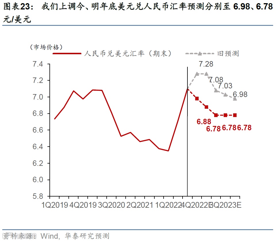 随着疫情防控政策优化的落实,我们上调2022年底美元兑人民币汇率预测至6.98(此前预测为7.28元/美元)。随着疫情防控政策优化以及稳地产政策力度加大,国内增长预期明显改善,叠加美元指数走弱,近期人民币兑美元汇率快速走强。虽然实体经济的修复尚待时日,但资产价格交易的是增长预期,所以人民币汇率和人民币资产价格的估值重估可能是“即时性”的,由此我们将2022年底美元兑人民币汇率从此前的7.28元/美元上调至6.98元/美元(图表23)。