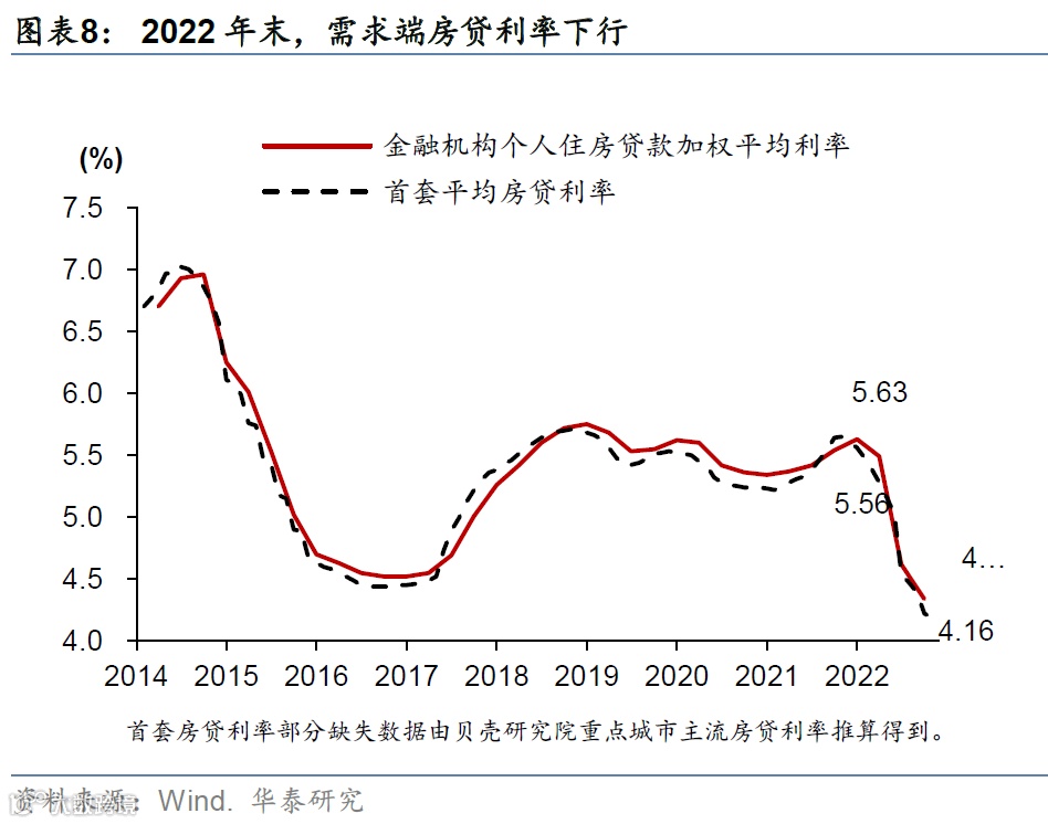 同时,地产需求端政策从今年2季度来密集调整,累积宽松幅度已经匹敌2014-15的稳增长周期,以房贷利率为例,目前金融机构个人住房贷款加权平均利率和首套平均房贷利率分别为4.34%、4.16%,较2022年初下降30-40个bp,也已经低于2016-2017年的低点,居民房贷还款压力有明显缓解(图表8和9)。然而,由于疫情的影响,地产销售仍未出现明显突破。但我们预计,随着防疫政策的快速优化,地产需求侧政策宽松的效果也有望逐步释放。