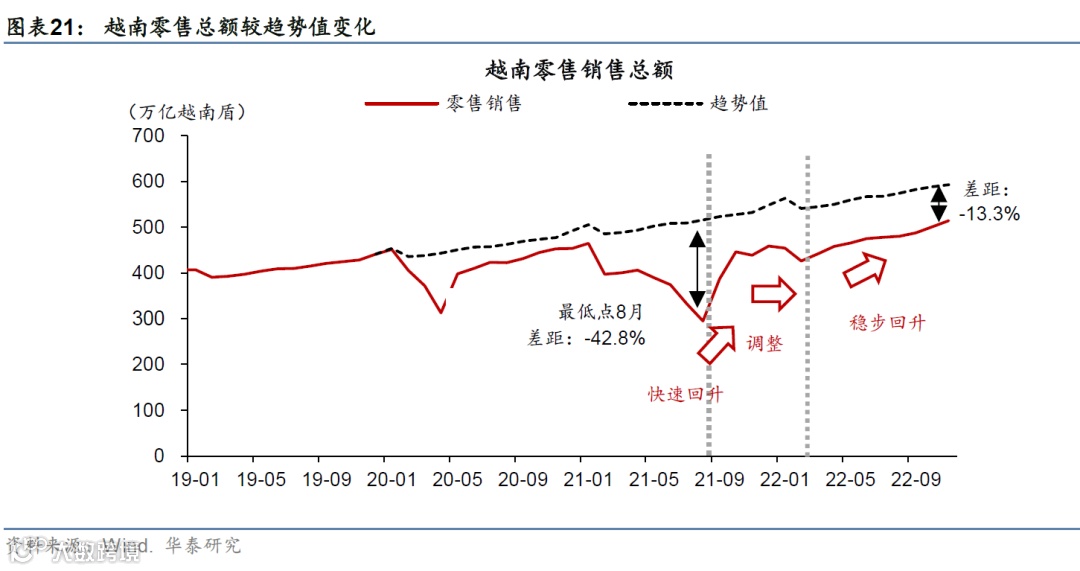 复盘越南在防疫政策放松后消费需求恢复的节奏来看,2021年10月逐步放开防疫管制、2022年3月完全放开后,即使在无政府财政补贴的条件下,重启后自发的服务消费需求带动收入回升,有力推动消费需求恢复,(参见《浅析越南经济重启进程》2022/12/5)。
