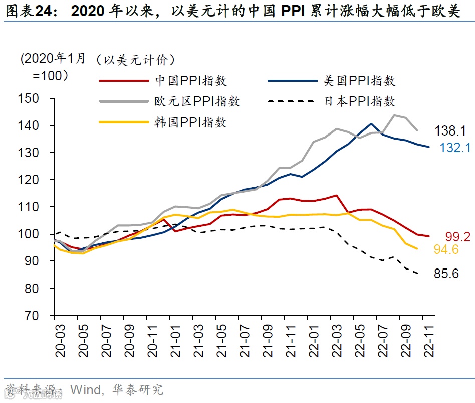 1)经历全球疫情和俄乌冲突的冲击后,中国制造业在劳工、能源、房租等方面的成本优势更为突出,因此基本面并不支持人民币大幅贬值(图表24);参见《中国贸易顺差逆势上升的成因与启示》, 2022/8/7)。