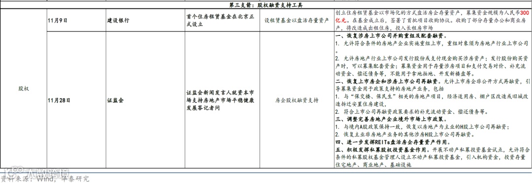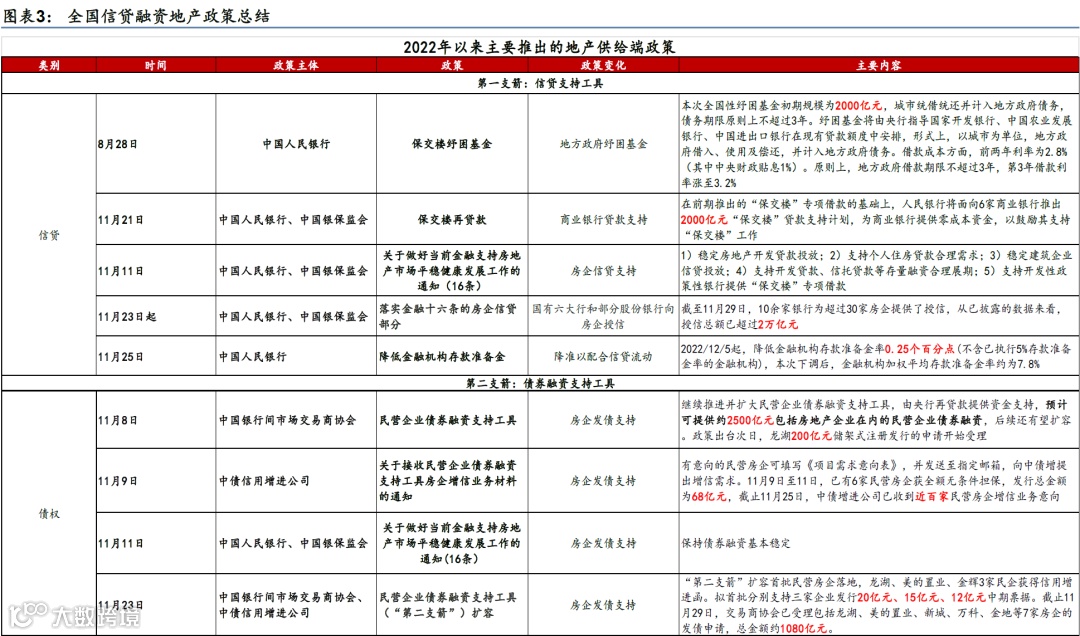 融资端,民营企业债券融资支持工具宣布延期并扩容、支持房地产在内的民营企业进行债券融资;人民银行、银保监会联合发布了金融16条,涉及开发贷款、信托贷款、债券融资、“保交楼”、受困房地产企业风险处置、个人住房贷款展期等诸多领域;11月28日地产企业股权融资“第三支箭”落地(图表3)。