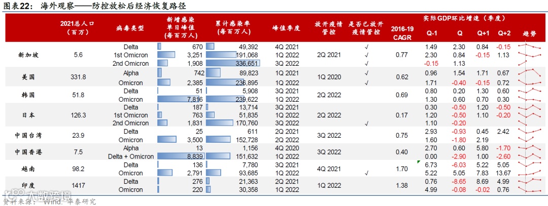 整体而言,从海外主要经济体疫情政策调整后的经济复苏进程来看,在奥密克戎疫情感染高峰之后,各国GDP增速均较疫情高峰的低点出现1-2个季度的环比快速回升,显示在疫情管控限制放开后的经济自身动能的较快恢复。(图表22)