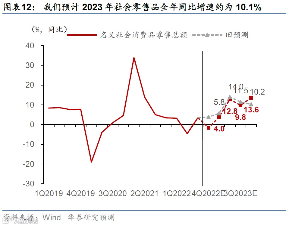 社零增速可能在2022年4季度再度转负,并将2022全年同比增速拉低至0附近,但是,社零增长可能由在2023年1季度回升至3%左右,且在2023年4季度达到13%以上的高点。值得一提的是,虽然体验式消费回升的空间显然最大,但“消费场景”的恢复意味着消费需求可能呈现“广谱式”回升态势,其中包括地产相关消费、大众消费(中低收入人均收入增长回升更快),以及一些传统意义上的“必选”消费,如服装,化妆品、零食及调味品、饮料、酒水等等(图表12)。
