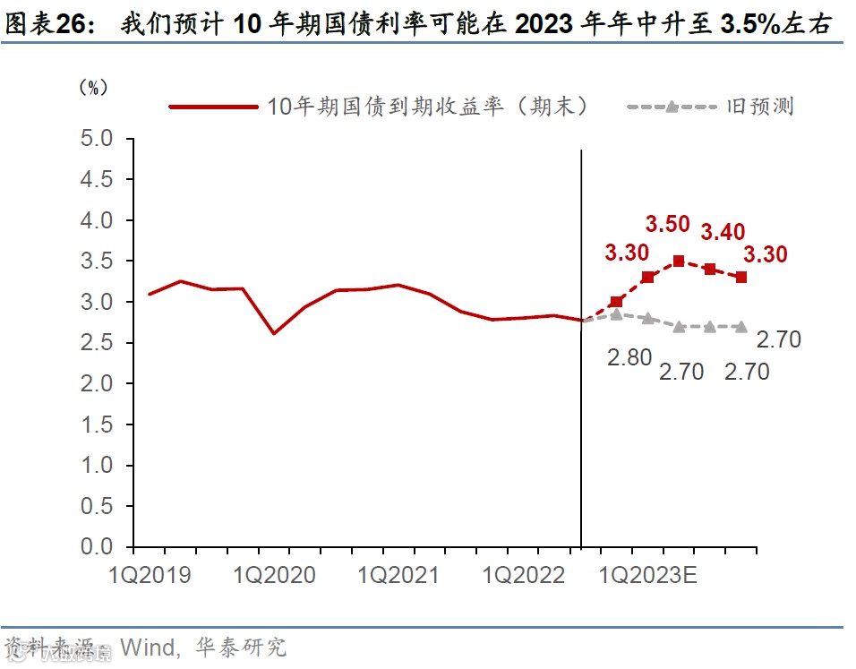 同时,我们上调2022年底美元兑人民币汇率预测至6.98,而随着增长持续修复、美元周期温和下行,我们预计2023年底人民币汇率温和升值至6.78(此前2022及2023年底预测分别为7.28和6.98)。虽然实体经济修复尚待时日,但人民币汇率和人民币资产价格的估值重估可能是“即时性”的、而国内利率也可能“水涨船高”。我们预计10年期国债利率可能在2022年底触及3%左右,而在2023年年中升至3.5%左右。
