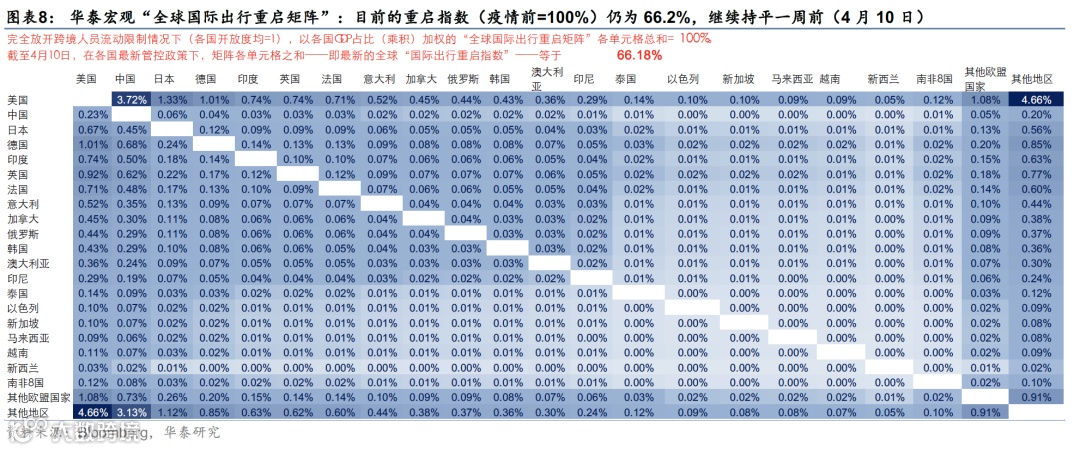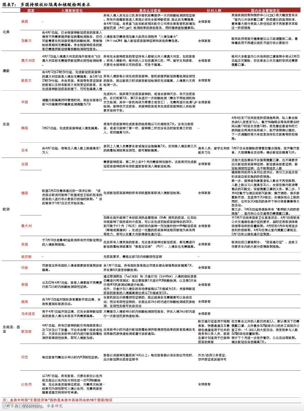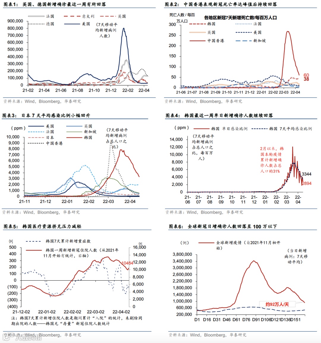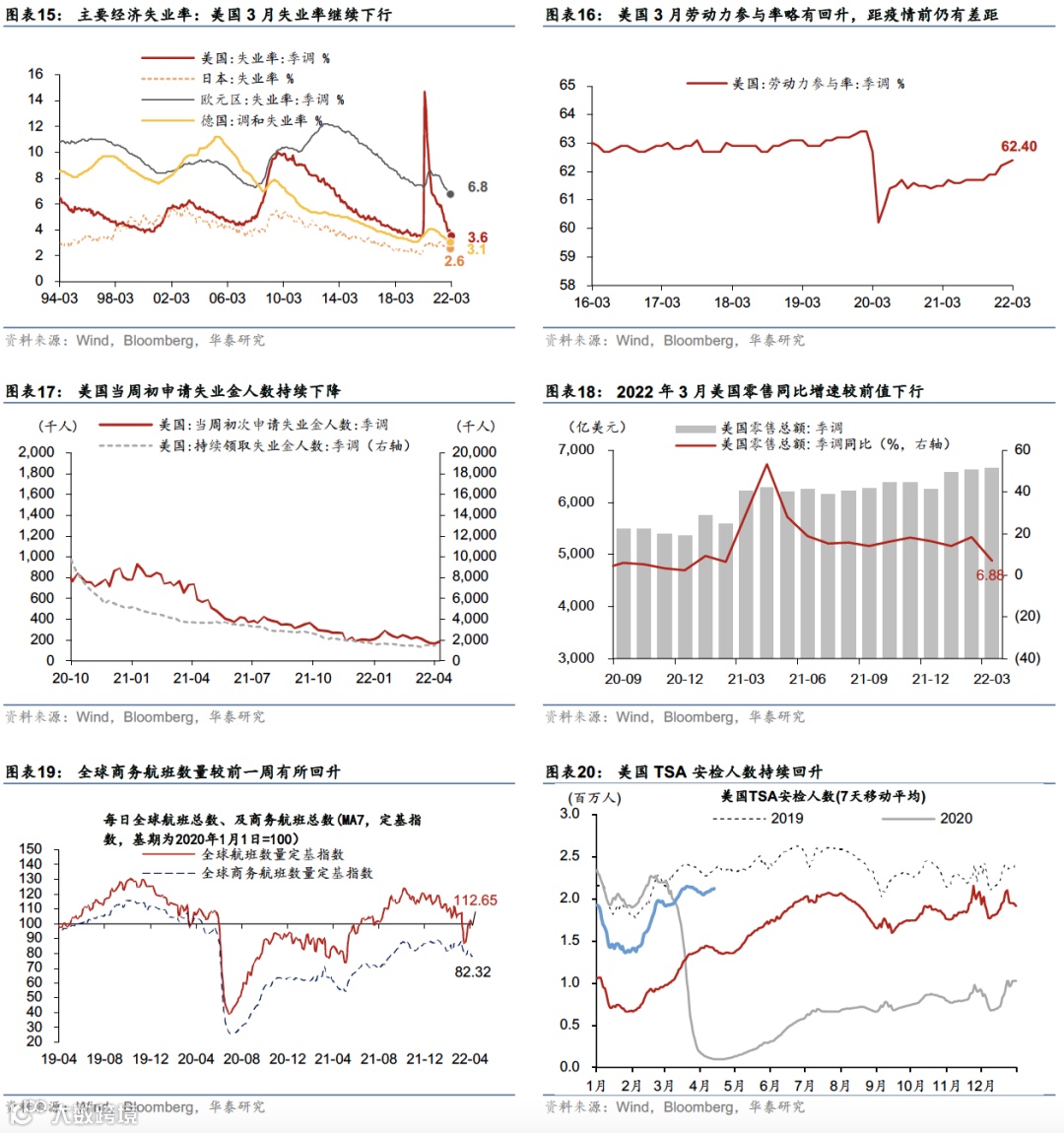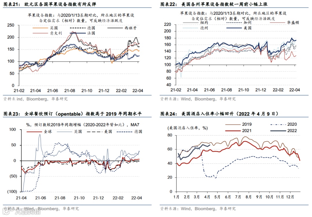 疫情跟踪:全球新冠7天平均新增确诊数回落至去年12月末的水平。截至4月17日,全球7天平均新增新冠确诊数近一个月累计回落约74万人,降至约92万人/天,大约是去年12月最后一周的水平。韩国、越南7天平均新增确诊数较本轮高点分别回落58%、83%,香港7天平均新增确诊人数降至2000人以下。韩国将从18日起全面解除防疫社交距离措施——包括公众场所营业限时以及聚会限员、大规模活动限制等。我们监测的“华泰宏观国际出行重启指数”(疫情前=100%)持平上周、为66.2%。过去一周,全球航班总数、商务航班总数分别反弹4.5%、1.7%;美国TSA航空安检人数反弹2.6%。