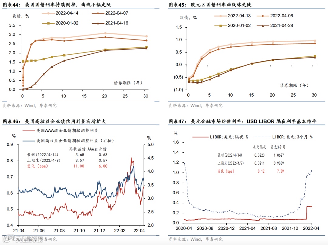 截至4月15日,10年期美债名义利率一周再上行11bp至2.83%,“反超”3/5年期美债利率;而3月20日~4月8日均处于倒挂状态。名义利率逐渐“赶上”通胀预期,美债10年期真实利率上行至-0.06%——自2020年3月下旬以来一直为负值。美国30年期抵押贷款按揭利率升至4.86%(今年4月份平均值),已较本轮低点(去年1月)上行近220bp。