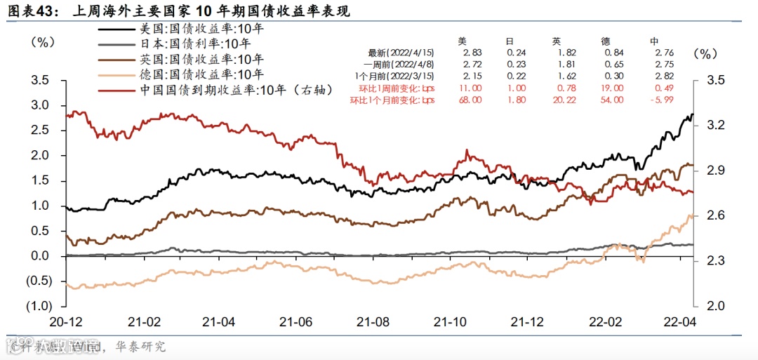 欧央行4月议息重申二季度末正式结束QE、结束QE“一段时间”(some time)后“逐步加息”。欧央行本次对加息时点的引导,较市场预期略晚——此前市场预期最早6月就可能加息。目前市场预期调整为欧央行可能在6月议息时明确加息时点、首次加息可能在9月份。短期欧央行暂缓加息不代表欧元会结构性走弱,从近期法国、德国表态来看,未来欧洲在核能、军备等方向加大财政投入或“势在必行”——欧盟财政扩张的动力上升,中长期来看仍可能推升长端利率和欧元汇率。德国10年期国债收益率上行至0.84%、一周上行20bp。