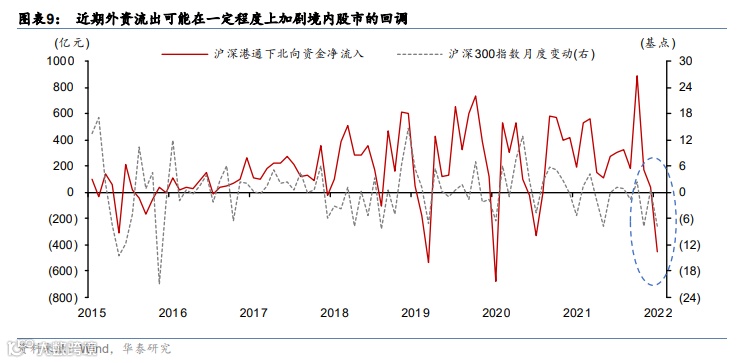 我们认为,外汇流入开始弱化的根本原因可能在于,市场可能在2月后对中国金融稳定性的信心边际减弱、即中国资产的隐含风险溢价有所上升。而这也可能是目前人民币名义汇率的真正的“痛点”(而非利差)。——历史数据显示,中国金融系统性风险上升通常伴随人民币汇率贬值预期升温、跨境资本流出压力加大,如中国5年期国债CDS利差与衡量人民币兑美元汇率贬值预期的风险逆转指标之间呈现明显的正相关(图表7)。去年下半年以来,地产快速去杠杆明显推升相关偿债风险,中国5年期国债CDS利差已有所抬升;今年来增长下行压力加大,叠加地缘政治不确定性上升,明显推高中国5年期国债CDS利差,导致跨境资本流动波动加剧。相比之下,中美利差收窄并不足以解释为何今年2月外资大幅卖出境内债券,且外资流出反而可能在一定程度上加剧了境内股市的回调(图表8和9)。