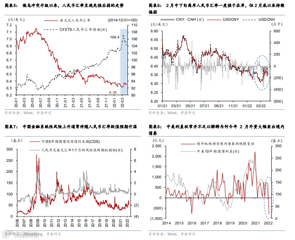 俄乌冲突升级及随后的金融制裁,可能引发避险情绪,但这至多形成资本流动及汇率的“边际压力”,且人民币总体表现在新兴市场货币中十分亮眼。——俄乌冲突升级以来,人民币汇率呈现先强后弱的走势。俄乌冲突升级初期(2月14日-3月9日),在岸人民币兑美元汇率升值0.7%,人民币CFETS指数大涨4.5%,尤其是2月14日至2月25日,离岸人民币兑美元汇率持续强于在岸,反映全球避险资金一度涌入人民币资产(图表5和6)。然而,在2月26日西方国家宣布对俄罗斯实施金融制裁之后,离岸人民币兑美元汇率持续弱于在岸,且两者点差在3月11日以来明显走阔,显示全球避险情绪升温开始驱动跨境资本流出中国。受此影响,3月10日后在岸人民币兑美元汇率贬值0.7%,人民币CFETS指数跌2.7%。