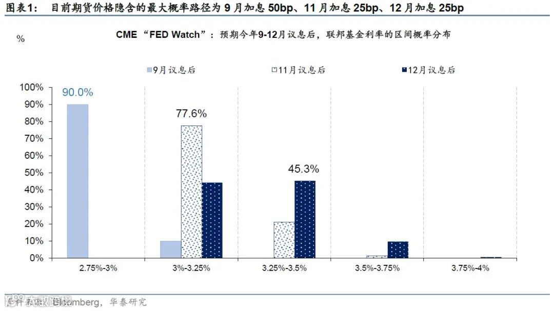 我们目前预计联储的加息路径是:9月加息50bp,11月和12月各加息25bp——与期货价格隐含的“最大概率”加息路径一致。本次FOMC决议公布后,根据CME数据,期货价格隐含9月加息50bp的概率达到90%,(这一概率)较议息前上升19.6pct;预计11月加息25bp的概率最大(隐含概率77.6%),较决议之前上升25.7pct;预计12月加息25bp的概率在决议后未发生变化。如果增长减速超预期,不排除联储会略微放缓加息步伐,但我们维持此前观点,即目前通胀走势暂不足以让联储很快停止加息。