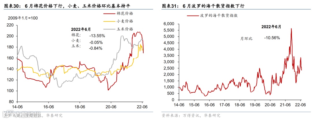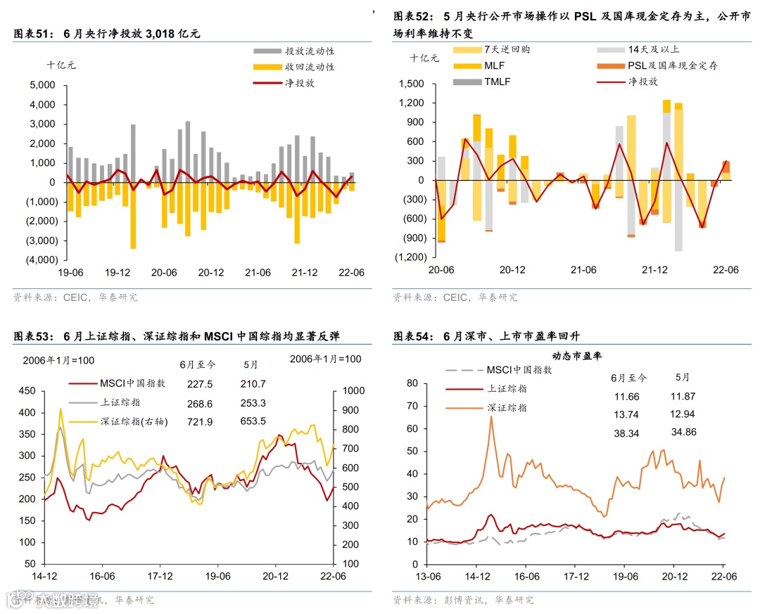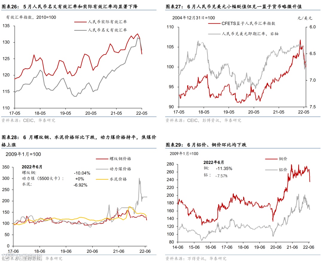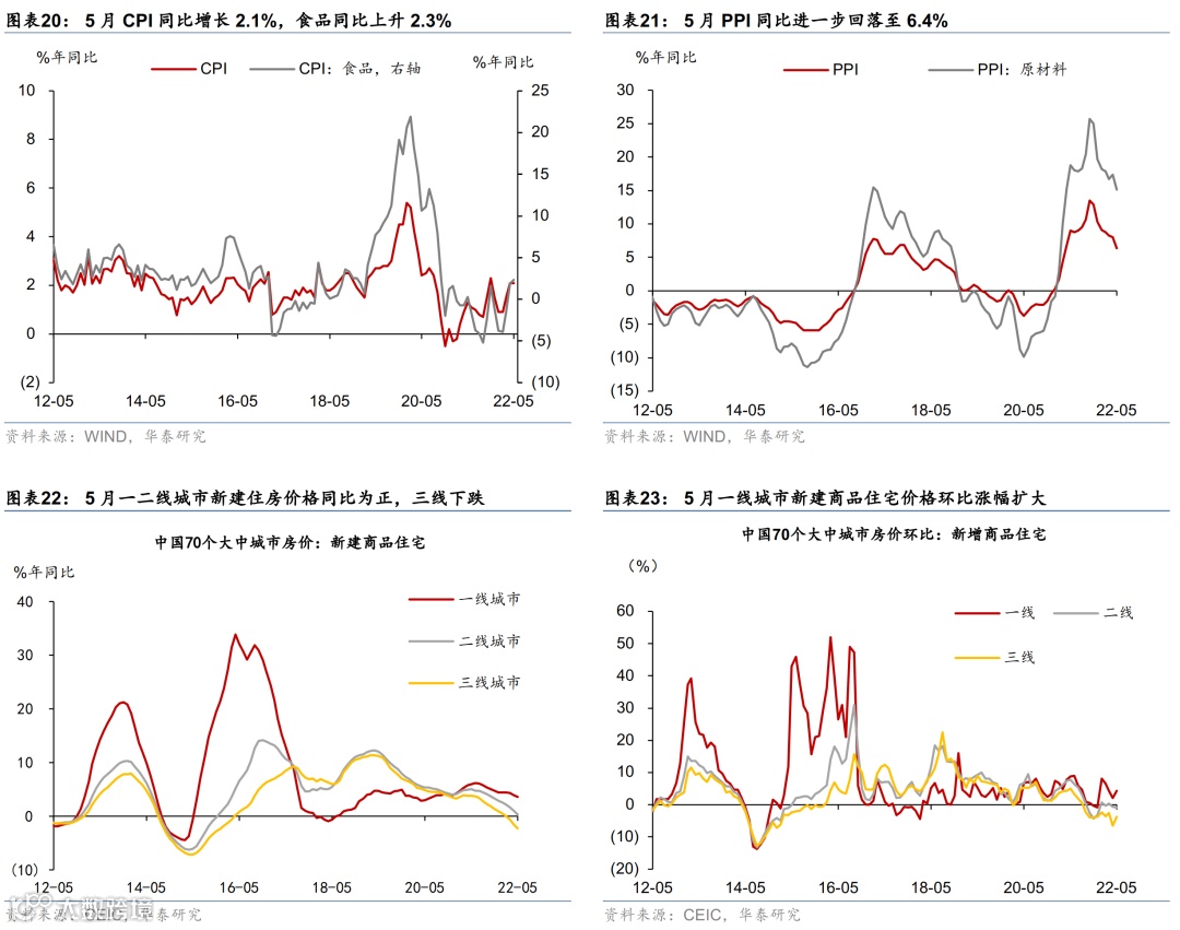 经济活动:6月全国疫情基本回归平稳,消费及房地产销售(主要是一二线城市)景气度低位回升,6月下旬基建加速。6月1-28日全国累计本土确诊病例813例,本土无症状感染者1,239例,上海6月1日全面恢复生产生活秩序。全国物流通行效率继续改善,6月公路整车货运流量指数及物流园区吞吐指数均相比5月上升8%,但同比仍有接近20%左右降幅。疫情期间被压抑的消费需求开始释放,18城地铁客运量较去年同期跌幅缩窄至18%(5月为43%),6月1-19日全国乘用车零售销量同比上行24%,较5月的-17%明显改善;同时,一二线城市商品房销售回暖,6月1-28日30城商品房销售面积同比跌幅从5月的50%迅速收窄至17%,1-23日60城新房销售面积同比下降25%,但百城土地成交面积同比降幅仍有45%。基建投资有加速迹象:建筑钢材成交量/水泥开工率同比较2021年下行22%/14%,但跌幅较上月收窄、尤其是6月下旬上行明显,且水泥开工率近期逆季节性上行。