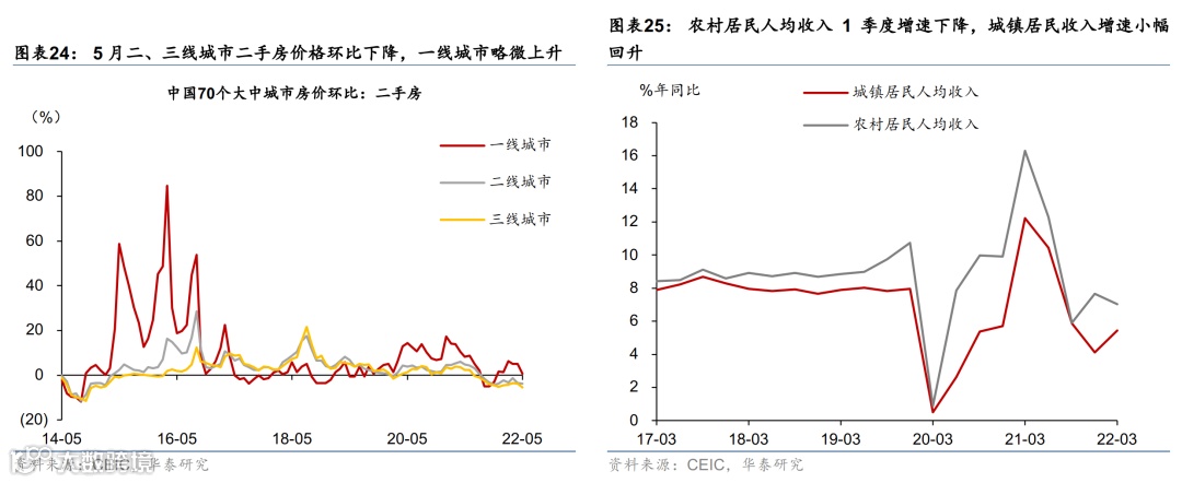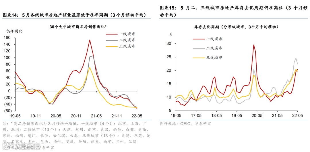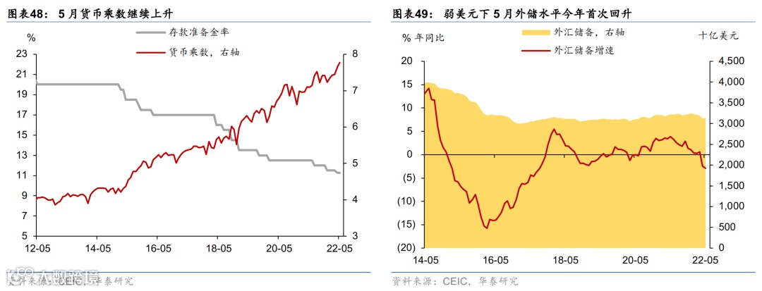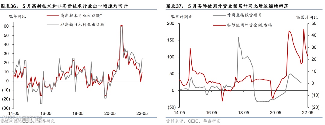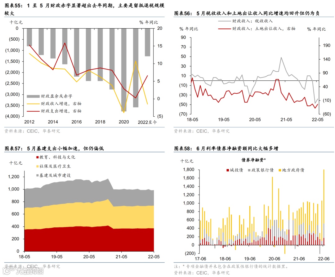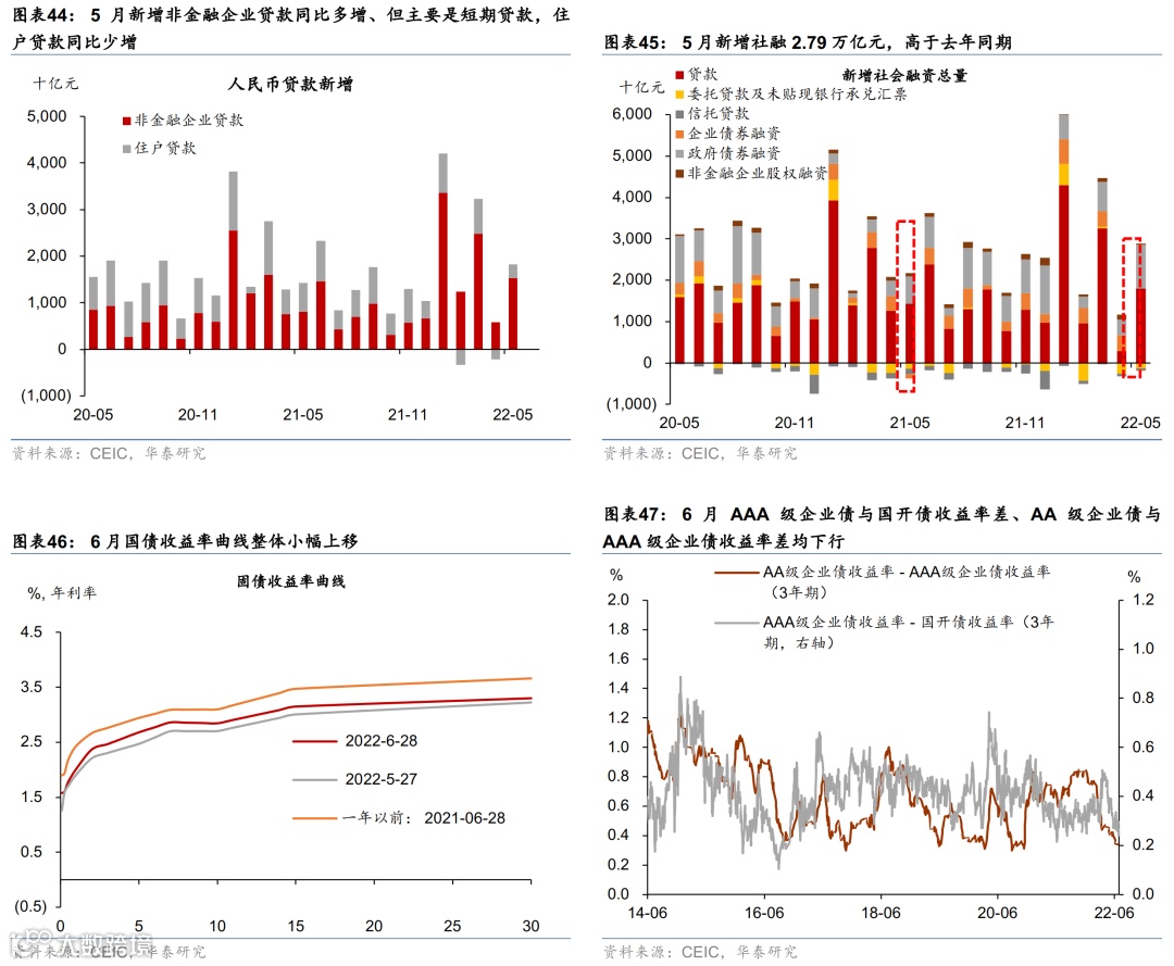 经济活动:6月全国疫情基本回归平稳,消费及房地产销售(主要是一二线城市)景气度低位回升,6月下旬基建加速。6月1-28日全国累计本土确诊病例813例,本土无症状感染者1,239例,上海6月1日全面恢复生产生活秩序。全国物流通行效率继续改善,6月公路整车货运流量指数及物流园区吞吐指数均相比5月上升8%,但同比仍有接近20%左右降幅。疫情期间被压抑的消费需求开始释放,18城地铁客运量较去年同期跌幅缩窄至18%(5月为43%),6月1-19日全国乘用车零售销量同比上行24%,较5月的-17%明显改善;同时,一二线城市商品房销售回暖,6月1-28日30城商品房销售面积同比跌幅从5月的50%迅速收窄至17%,1-23日60城新房销售面积同比下降25%,但百城土地成交面积同比降幅仍有45%。基建投资有加速迹象:建筑钢材成交量/水泥开工率同比较2021年下行22%/14%,但跌幅较上月收窄、尤其是6月下旬上行明显,且水泥开工率近期逆季节性上行。