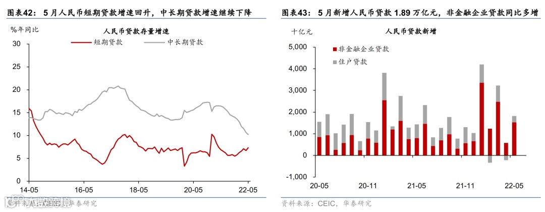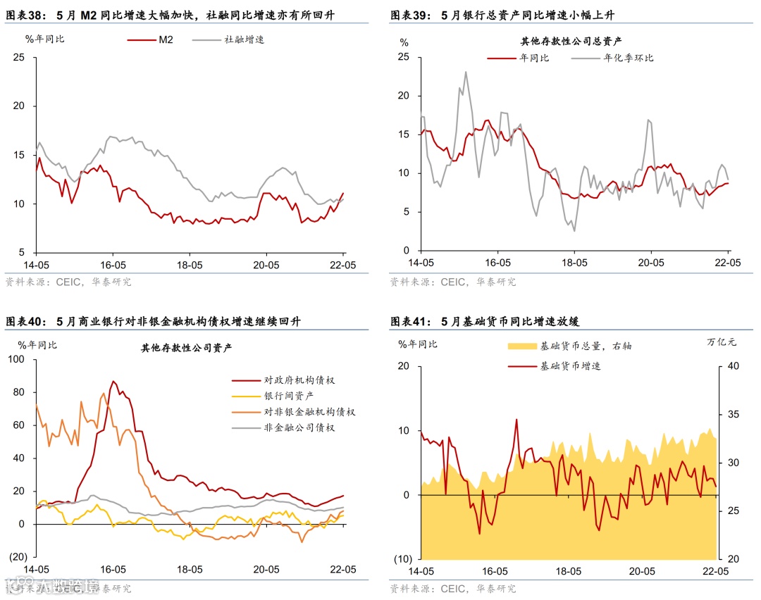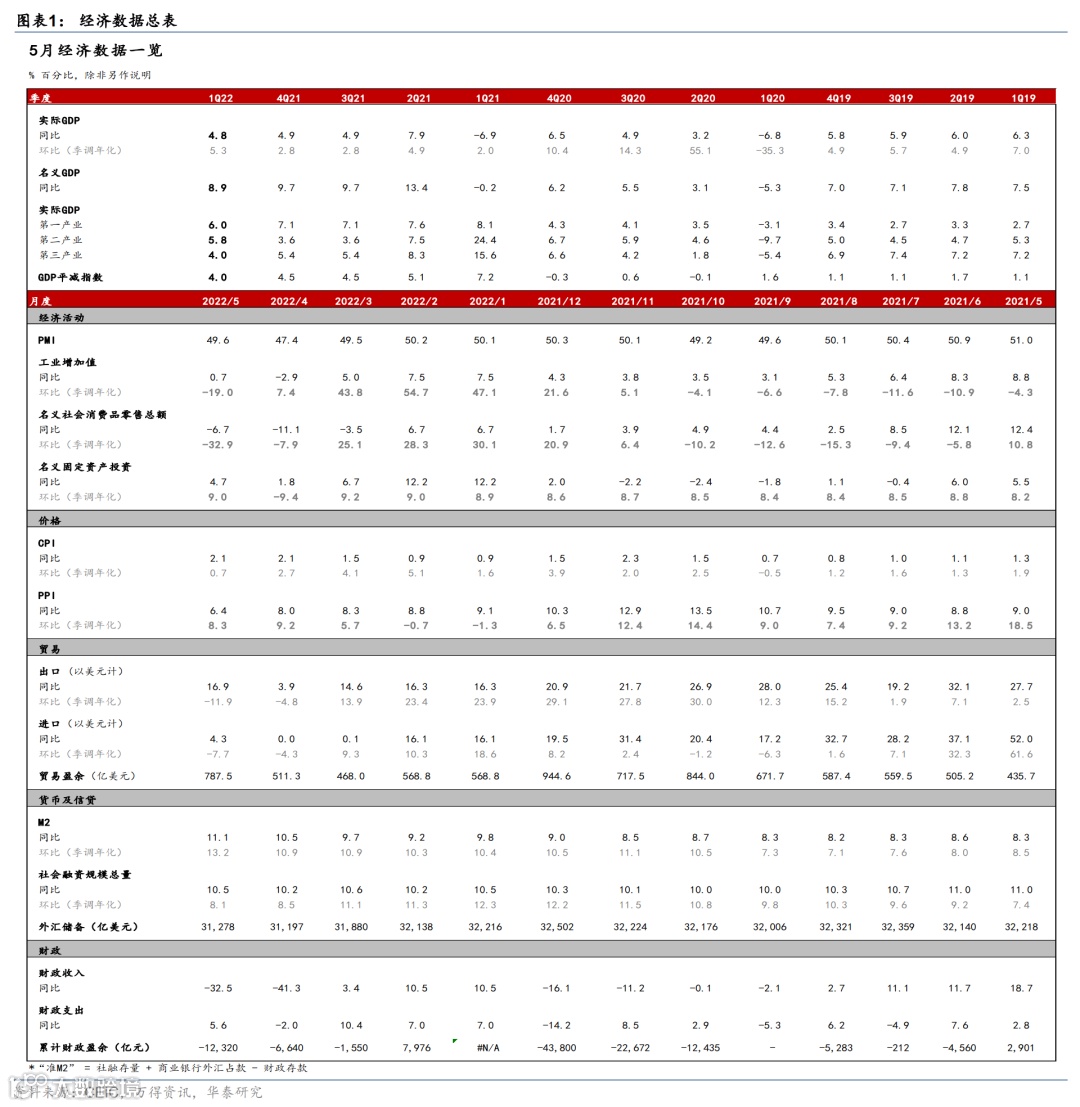 5月重要宏观数据回顾:疫情对经济增长冲击犹在、但幅度较4月缓和。生产复苏较消费更快:工业增加值同比增速回升至0.7%,社零同比增速回升至-6.7%,汽车、手机的反弹最为显著、但仍为负增长。房地产投资继续负增长,基建投资增速温和回升。货币宽松效果初显:5月M2、新增人民币贷款与新增社融均高企,企业短期贷款与票据融资、以及政府债融资同比多增,而居民中长期贷款仍同比明显少增。财政方面,留抵退税快速推进、财政支出力度加大推升5月广义财政赤字至9,138亿元,同比扩张9,529亿元。