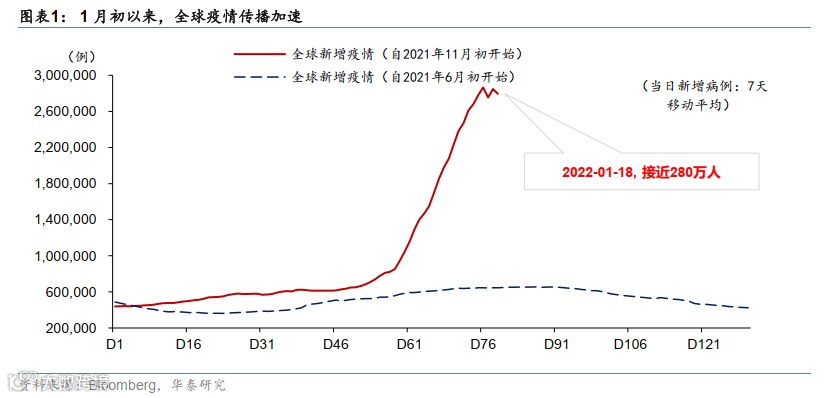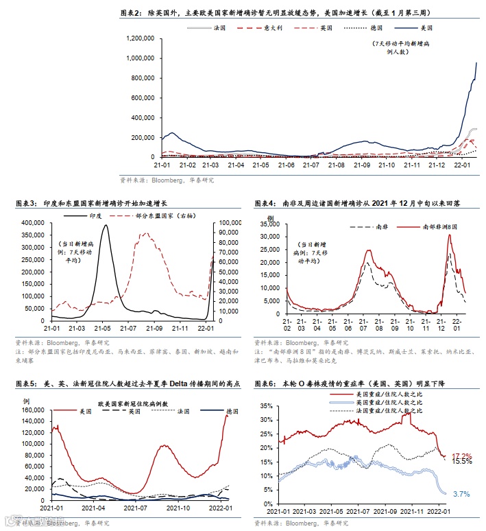 1月初以来,大多数欧美国家新增确诊继续加速、而英国和南非放缓。住院人数上升较快、但轻症居多,美国和英国的重症/住院人数之比较去年夏季Delta期间明显下降。截至1月19日,全球每日总新增确诊(MA7)较1月初增长116%,美国(173%)、法国(106%)、德国(152%)、意大利(121%)、日本(接近50倍)增幅较大。本轮疫情发展“滞后”于欧美国家的新兴市场,近两周疫情形势也趋于严峻。但南非和英国新增确诊先后见顶,英国重症、死亡率未见走高,一定程度上缓和了市场恐慌情绪。