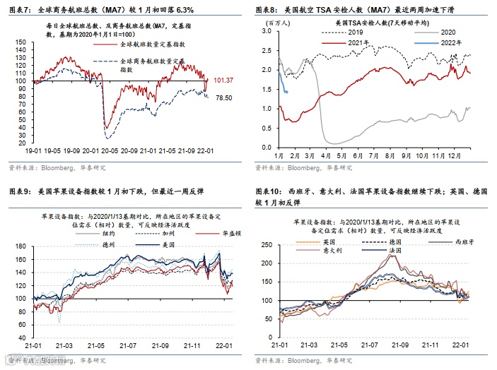 O毒株传播较快、导致航司人手不足,航班延误/取消大增,1月初以来,美国航空出行指标下行压力较大。截至1月19日,全球航班总数(MA7)近两周有所恢复,较2019年同期高3.8%、较1月初回升16%;但全球商务航班总数(MA7)仍较2019年同期低18.8%,较1月初回落6.3%(图表7)。美国航空TSA安检人数(MA7)最近两周加速下滑(图表8),较2019年同期低22%、较1月初降幅达到25%。
