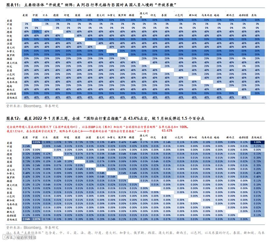 截至1月第三周,英国(从1月下旬开始)、美国(1月初开始)、加拿大(1月下旬开始)重新开始执行(类似)去年11月份、O株疫情爆发前的入境政策,即完全接种疫苗者入境无需隔离、只需要更短时间内的核酸检测。我们测算,截至2022年1月第三周,当前全球人员跨境流动“重启指数”在43.4%左右。相对1月初,重启指数回升约1.5个百分点(指数设定参见20220106《量化O株对全球重启的影响及其演变》,我们的华泰宏观“国际出行重启指数”可直观地监测全球各国防疫政策变化对跨国人员往来顺畅程度的影响,数值越低,则疫情对经贸往来的冲击越大。我们以近30个较大规模/受疫情影响较显著的经济体为“样本”列出矩阵,并将它们对其他国家的入境措施的松紧程度赋以数值、并以各国GDP占比做加权平均,最终合成“重启指数”)。