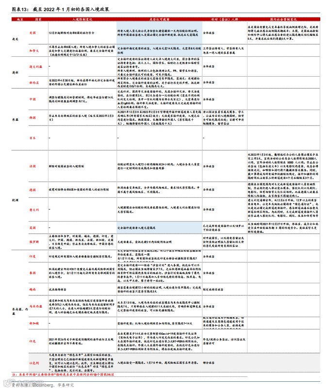 美国、英国、加拿大入境政策重新边际松动,其他欧洲国家暂维持较严格的隔离措施。截至1月第三周,日本仍全面封锁外国人入境;以色列开始允许“中风险地区”的国民入境;包括法国、德国、意大利在内的多数欧洲国家,以及韩国、印尼、泰国、新加坡、马来西亚、印度等亚太国家的入境管控措施仍较为严格,多数国家“要求完成疫苗接种、且入境后仍需接受一段时间(自我或集中)隔离”。而英国(从1月下旬开始)、美国(1月初开始)、加拿大(1月下旬开始)重新开始执行(类似)去年11月份、O株疫情爆发前的入境政策,即完全接种疫苗者入境无需隔离、只需要更短时间内的核酸检测。